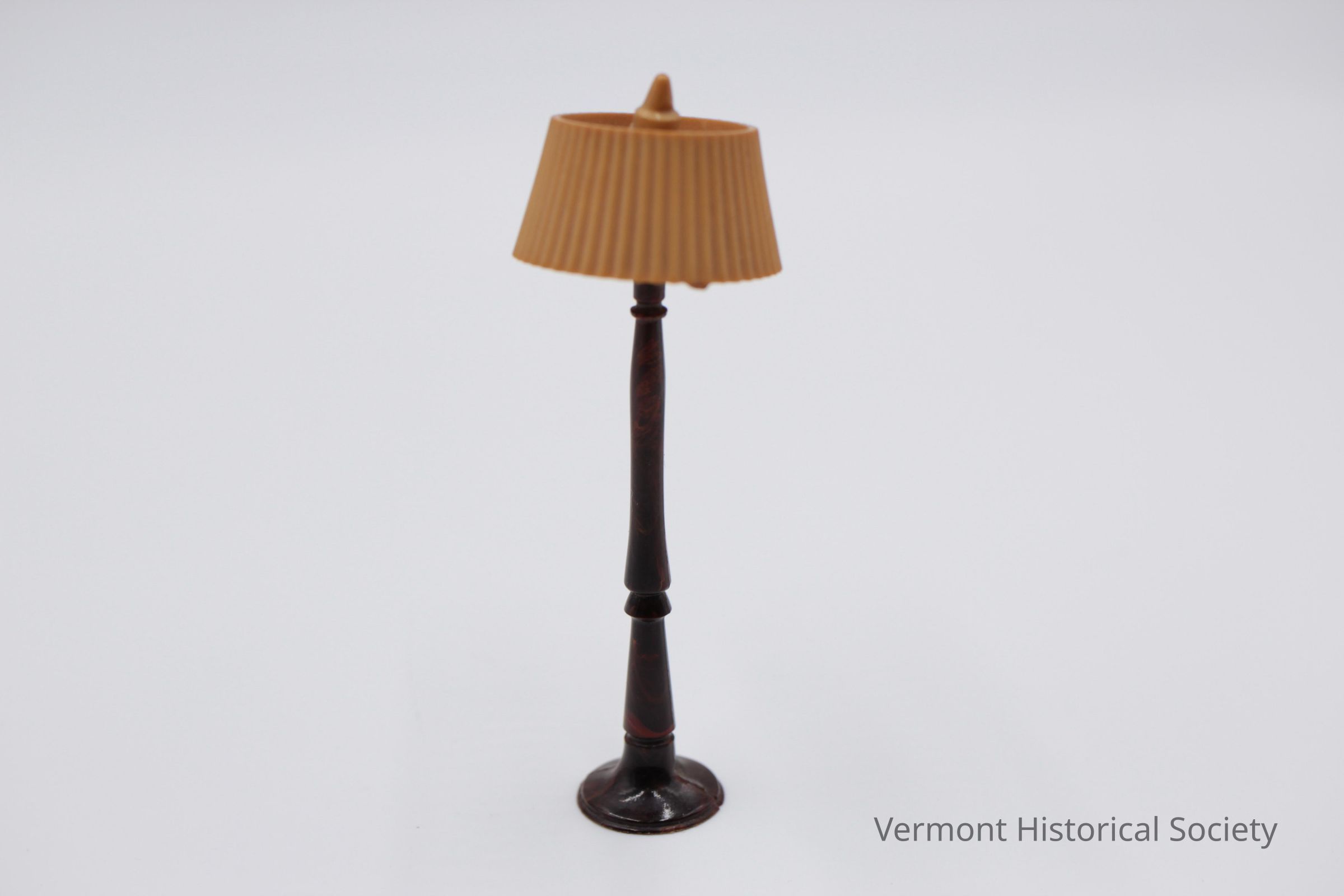 Miniature plastic floor lamp consisting of a dark brown pedestal and light brown shade. The shade is molded to appear fluted and slides over the top of the base at the center.Context