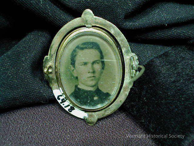 Oval brooch with a double-sided frame set into the center. The frame swivels to show two photographic portraits of young men, each with rose-tinted cheeks.