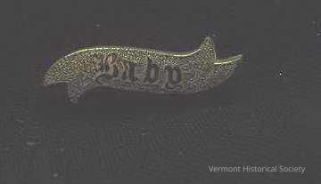 Gold pin in the shape of a banner with the word "Baby" in black lettering.