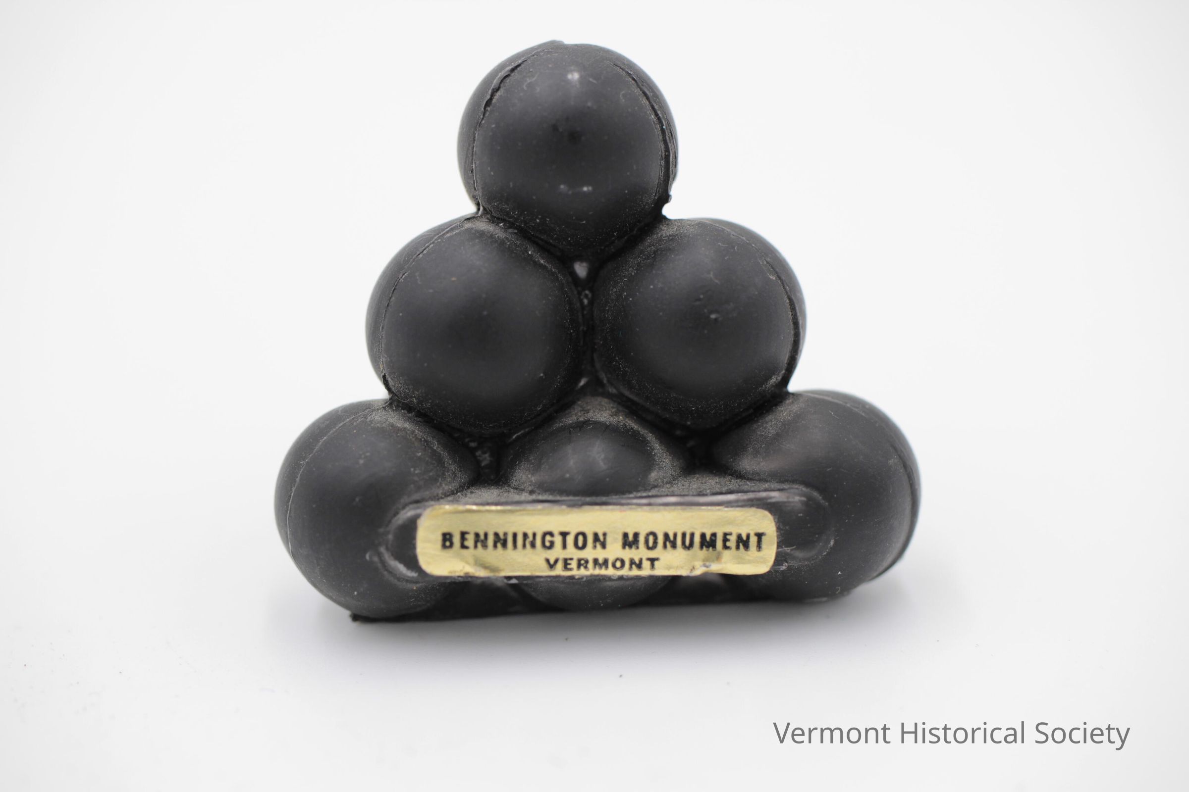 A tiny three-dimensional, triangular stack of 10 cannon balls made of metal and painted black. On one side in gold are the words, " Bennington Monument, Vermont."Context