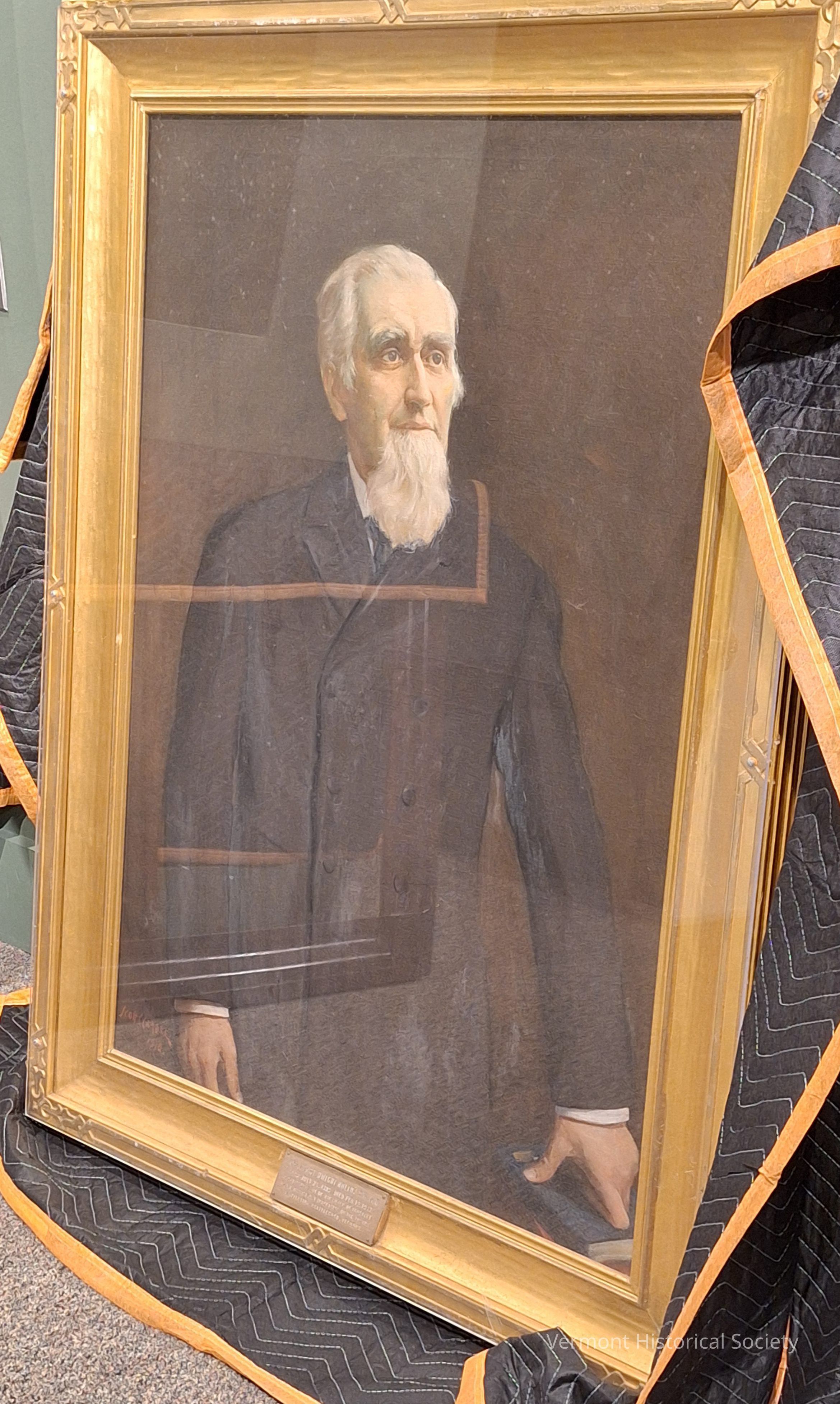 Oil on canvas portrait of Henry Holton by Scott C. Carbee. Dr. Holton stands tall against a dark background, looking just over the viewer's right shoulder and has short white hair and a medium-length white beard. He is dressed in a dark black coat and the white sleeves of his shirt are just visible at the wrists. His left hand rests on a stack of books. The painting is signed "Scott C CARBEE 1918" in red in the lower left corner and resides within a simple geometric-carved gilt frame. There is a name plate at the lower center of the frame that reads, "HON. HENRY DWIGHT HOLTON A.M, M.D. / BORN JULY 24, 1838, DIED FEB. 12, 1917. / FIRST PRESIDENT OF THE BOARD OF TRUSTEES AND A MUNIFICENT BENEFACTOR OF THE AUSTINE INSTITUTION, BRATTLEBORO, VERMONT."Type of Painting