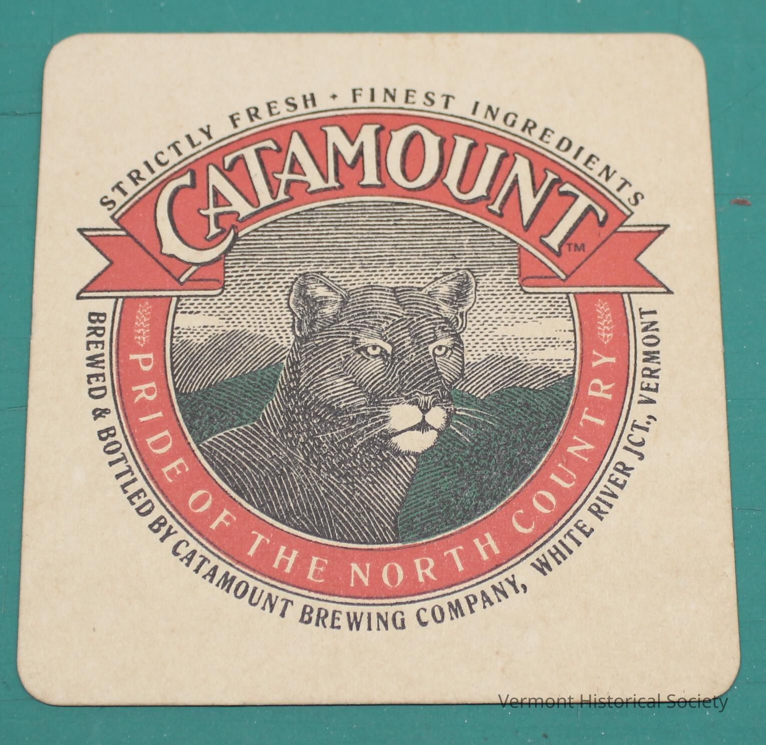 Catamount Brewing Company beer coaster. Printed in color on off-white heavy, absorbent paper; the back is blank; shows a cougar (catamount) in the center of a red circle, with green hills behind; circle shows CATAMOUNT written at the top and "Pride of the North Country" in the circle bottom. Above the top of the circle is written "Strictly Fresh - Finest Ingredients" ; along the bottom of the circle is written "Brewed & Bottled by Catamount Brewing Company, White River Junction., Vermont."Acquisition