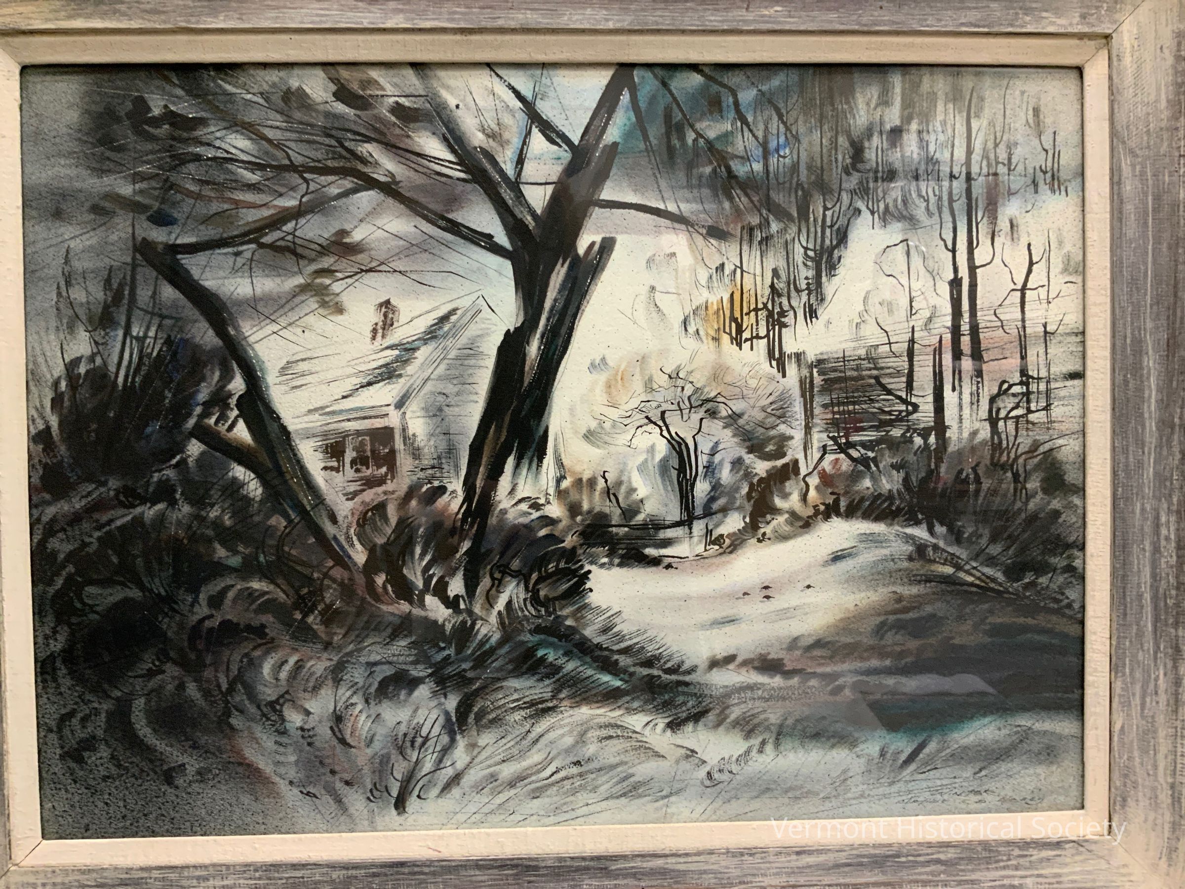 Mostly black and white watercolor on paper depicting a small house in the background, viewed through two trees in the foreground. Titled by the artist in lower right, "Winter."Type of Painting
