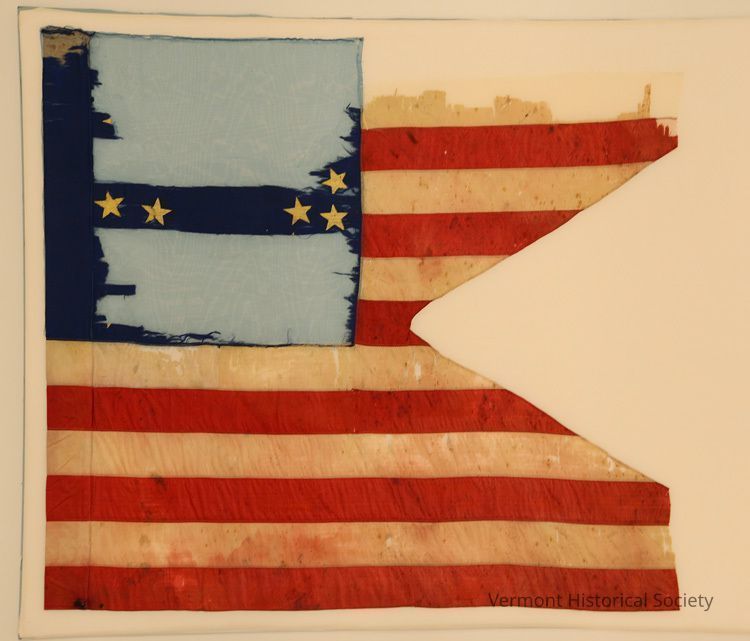 National guidon of the 1st Vermont Light Artillery Battery. Silk broadcloth in swallowtail form with red and white stripes, a blue canton and painted stars.