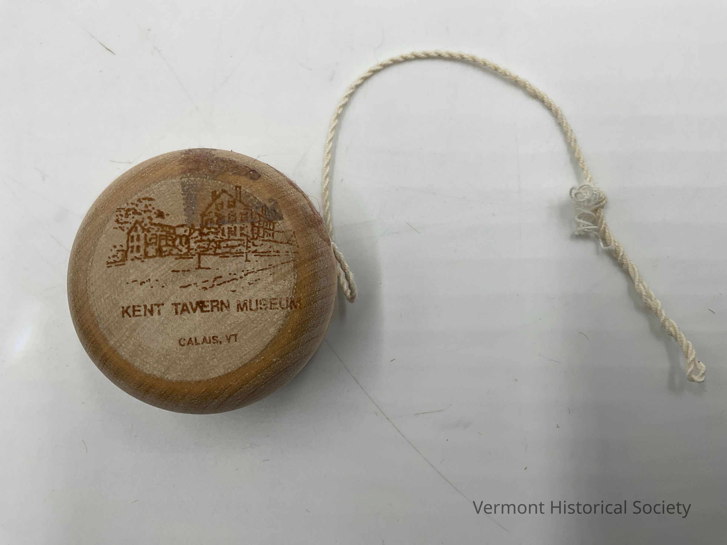 Pale wooden yoyo with the etched image of two buildings and the words, "Kent Tavern Museum, Calais, VT."Context
