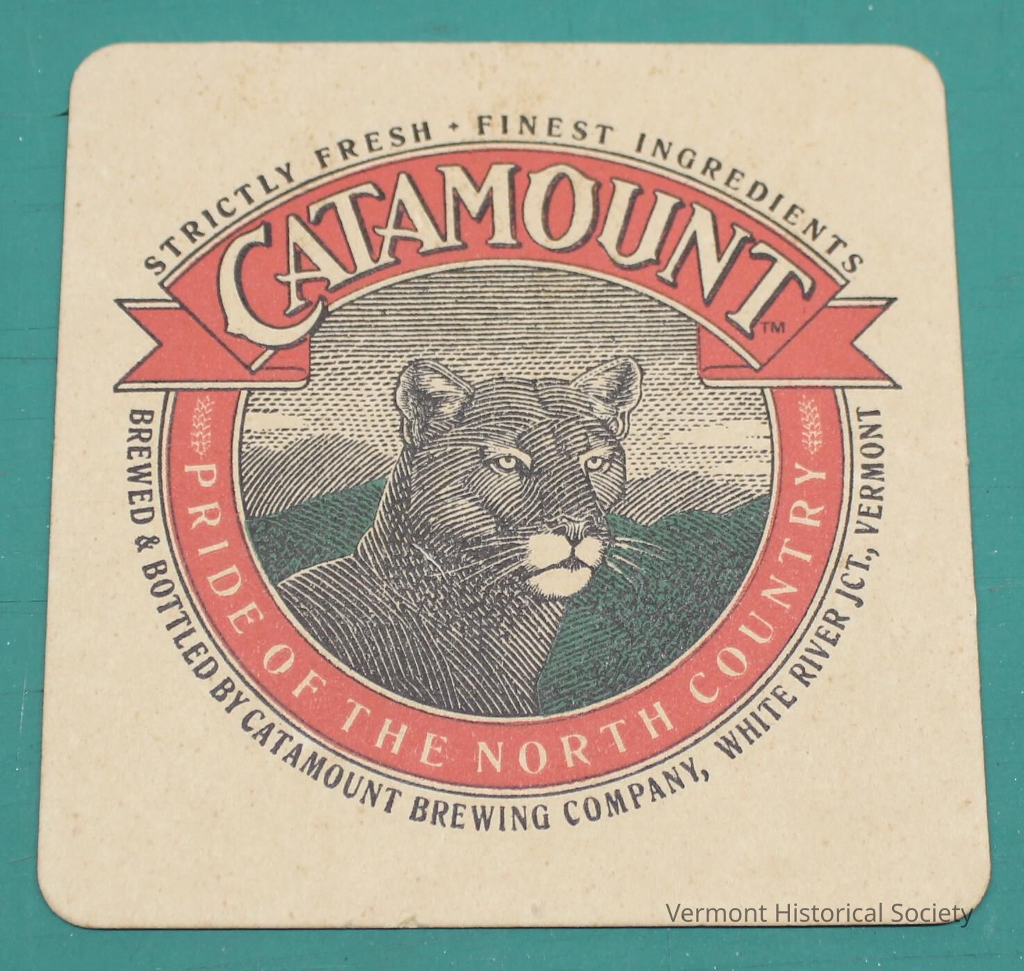 Catamount Brewing Company beer coaster. Printed in color on off-white heavy, absorbent paper; the back is blank; shows a cougar (catamount) in the center of a red circle, with green hills behind; circle shows CATAMOUNT written at the top and "Pride of the North Country" in the circle bottom. Above the top of the circle is written "Strictly Fresh - Finest Ingredients" ; along the bottom of the circle is written "Brewed & Bottled by Catamount Brewing Company, White River Junction., Vermont."Acquisition