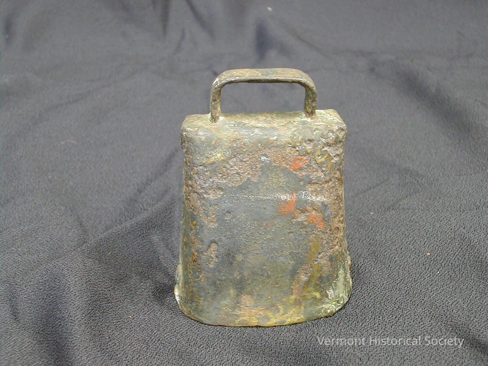 Sheep bell shaped like a cowbell. It is formed from one sheet of metal, folded into shape and bracketed on the sides. There is a rectangular handle at the top and a metal clapper in the interior.