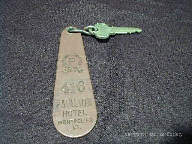 Small key attached to a large tag. The key is attached to the tag with a metal o-ring. The tag is stamped with a logo of the letter P within a wreath and the label, "416 / PAVILION HOTEL / MONTPELIER VT."