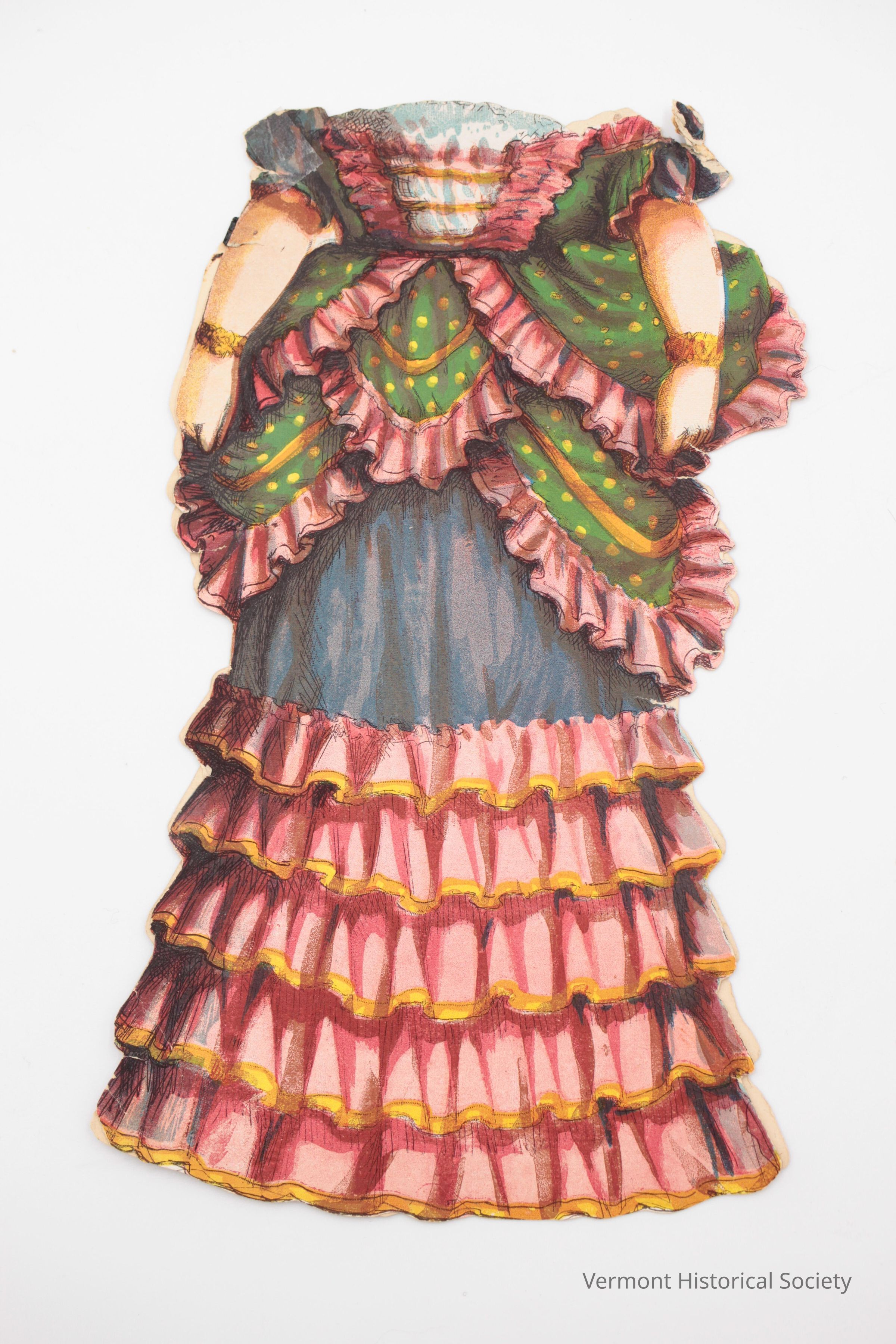 Two-sided paper doll dress. The dress has a green bodice and bustle trimmed with pink ruffles, and a blue skirt with five tiers of pink ruffles. The back shows that the bustle is tied with a yellow ribbon. The two sides are connected at the shoulder to fit over the doll.Acquisition