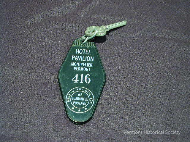 Small metal key attached to a large, plastic tag with a metal o-ring. The black plastic tag is printed with the label, "HOTEL PAVILION MONTPELIER, VERMONT 416" and a circular label saying, "DROP IN ANY MAIL BOX / WE GUARANTEE POSTAGE". "O. W. Doty" is scratched into the back of the tag, and "416" is stamped into the key.Context