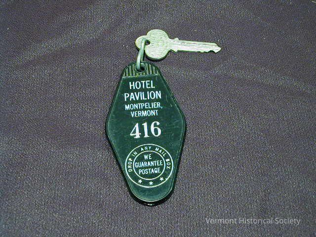 Small metal key attached to a large, plastic tag with a metal o-ring. The black plastic tag is printed with the label, "HOTEL PAVILION MONTPELIER, VERMONT 416" and a circular label saying, "DROP IN ANY MAIL BOX / WE GUARANTEE POSTAGE". "O. W. Doty" is scratched into the back of the tag, and "416" is stamped into the key.Context