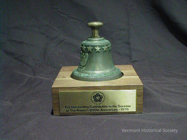 Metal bell and stand. The bell is molded with an eagle and stars and sits on a square, wooden base. The base has a metal plaque with the inscription, "For Outstanding Contribution to the Success of the Nation's 200th Anniversary - 1976" and the logo for the American Bicentennial Administration.Context