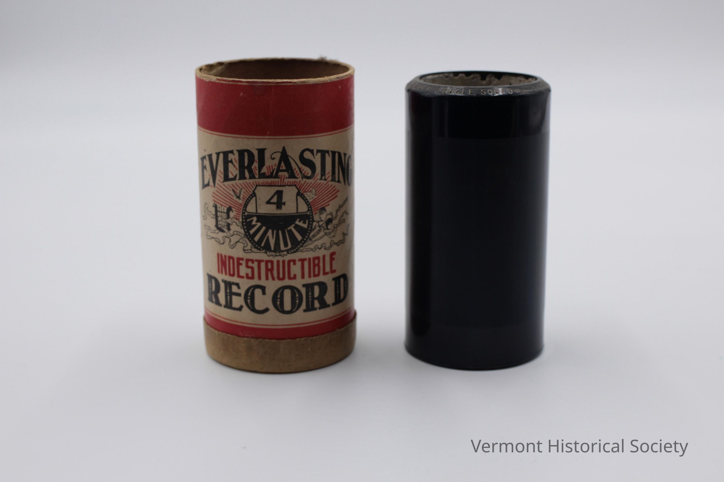 The cylinder is accompanied by a cardboard contain labeled, "EVERLASTING 4 MINUTE INDESTRUCTIBLE RECORD" on one side and "Fits all Standard Size Cylinder Machines / Greatest in Volume / Sweetest and Purest in Tone / Never Breaks / Never Wears Out"Use
