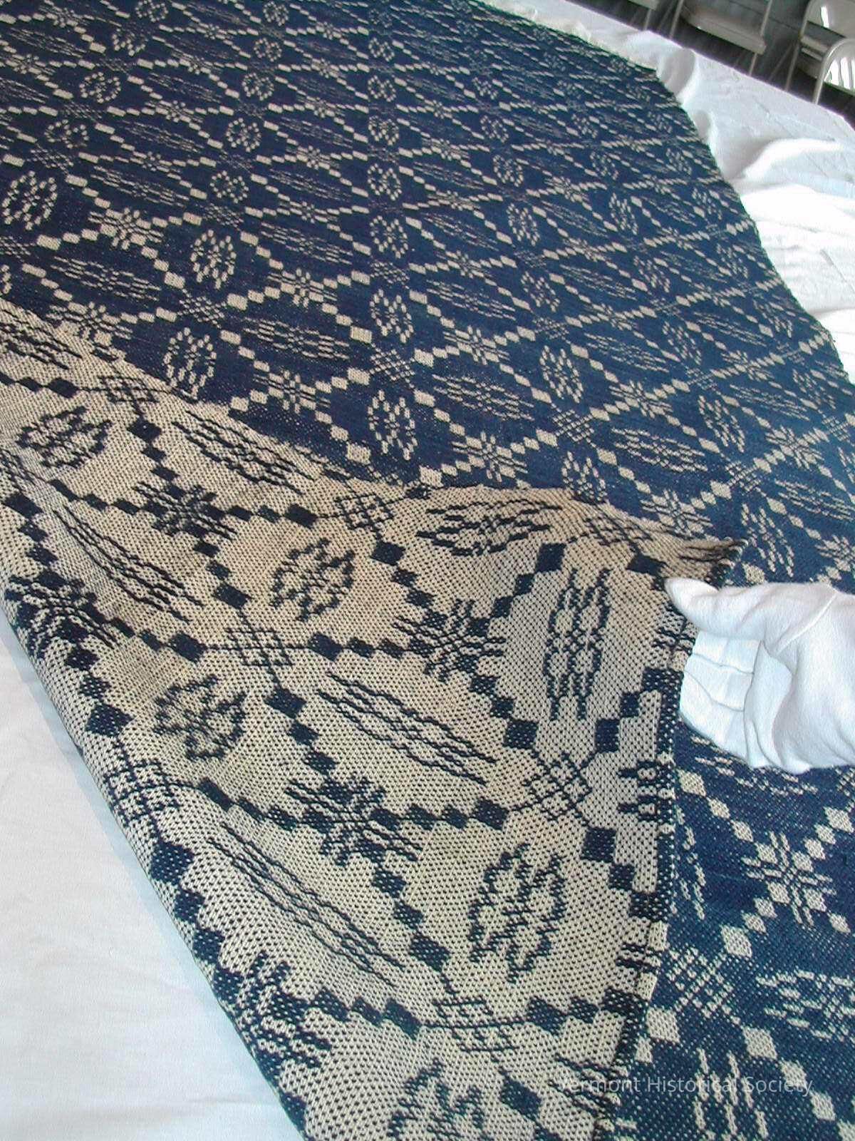 Half of a blue-and-white summer/winter coverlet made from cotton and wool.