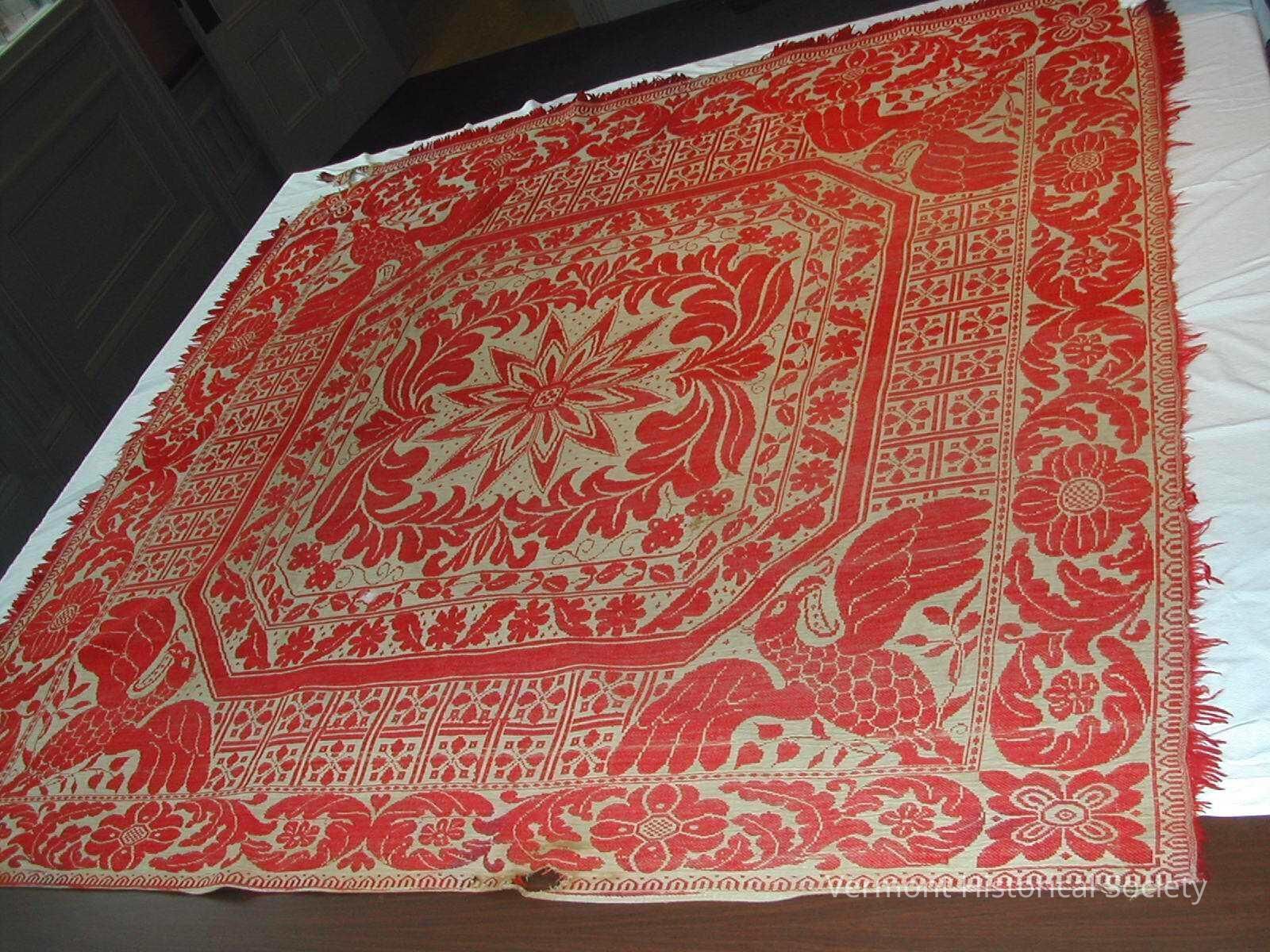 Red and white figured coverlet. The coverlet features a center medallion with a pointed star or flower surrounded by a laurel wreath and borders of flowers and oak leaves. Surrounded the center is a border design of tiles with folk-style eagles in each corner. The outer border consists of large leaves and flowers. There is red fring on three sides, and the bottom corners are rounded.