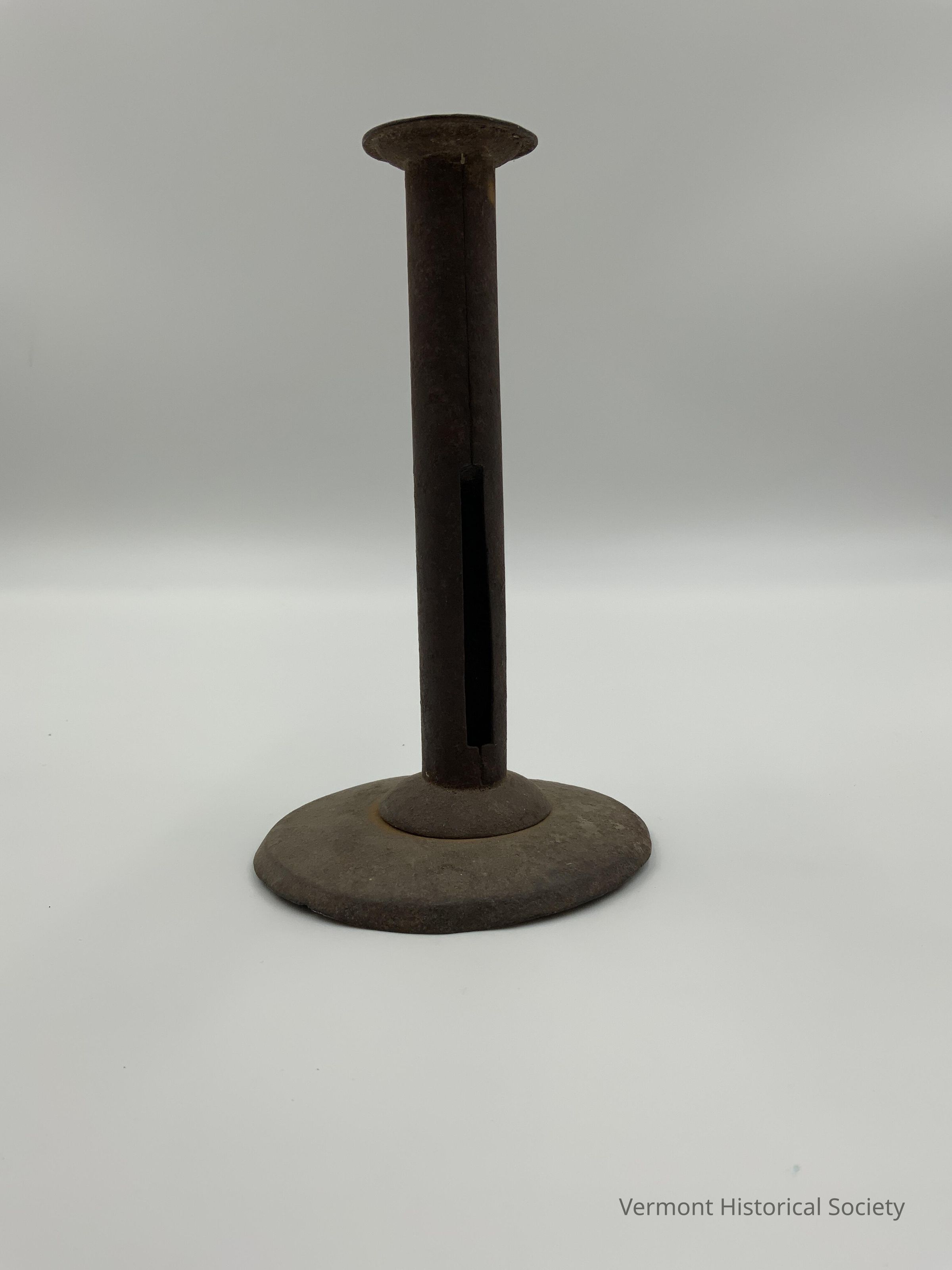 Straight tin candlestick with a round base. There is a tab on the side for raising the candle.