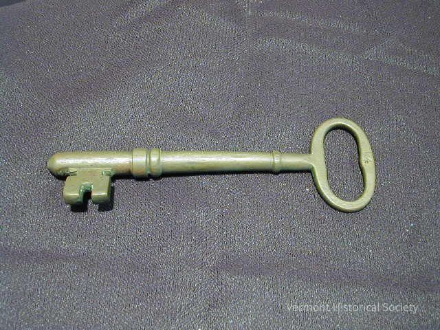 Large brass key with a two-pronged bit and oval bow. The bow and the bit are slightly misaligned. The center of the bow is stamped, "14".