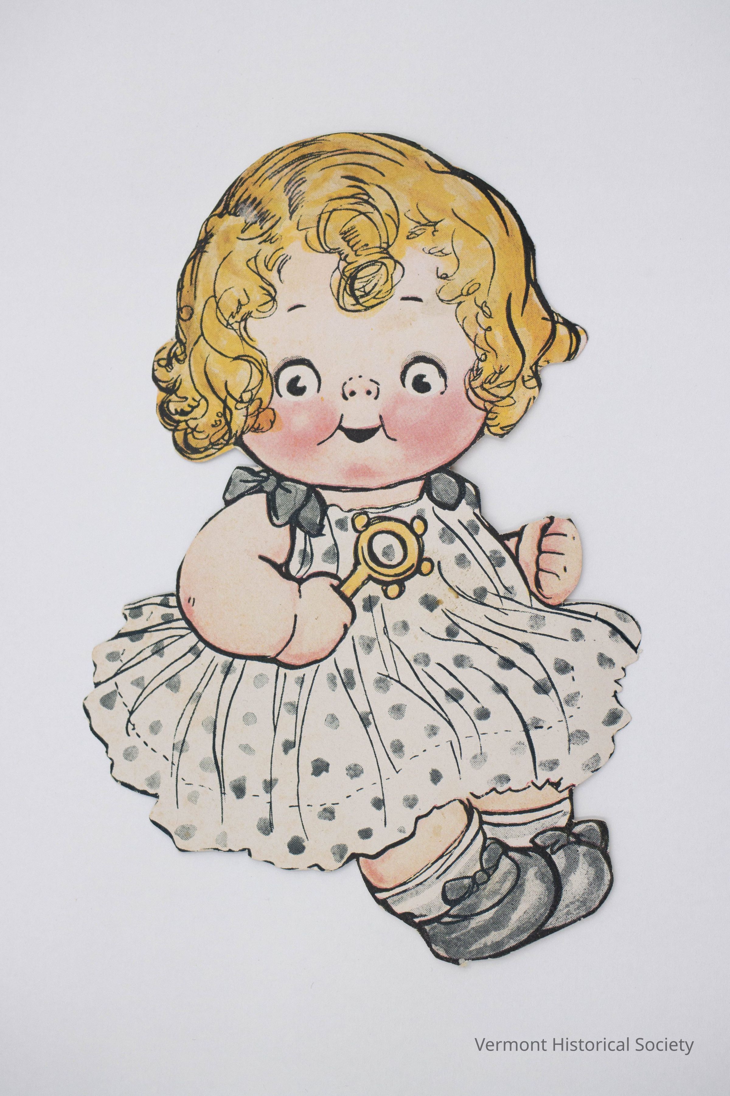 Small paper doll. The doll depicts a young child with yellow hair and pink skin wearing a white dress undergarment and blue socks and shoes. The back shows a portion of a magazine page and the handwritten label, "Erma Jenness".Context