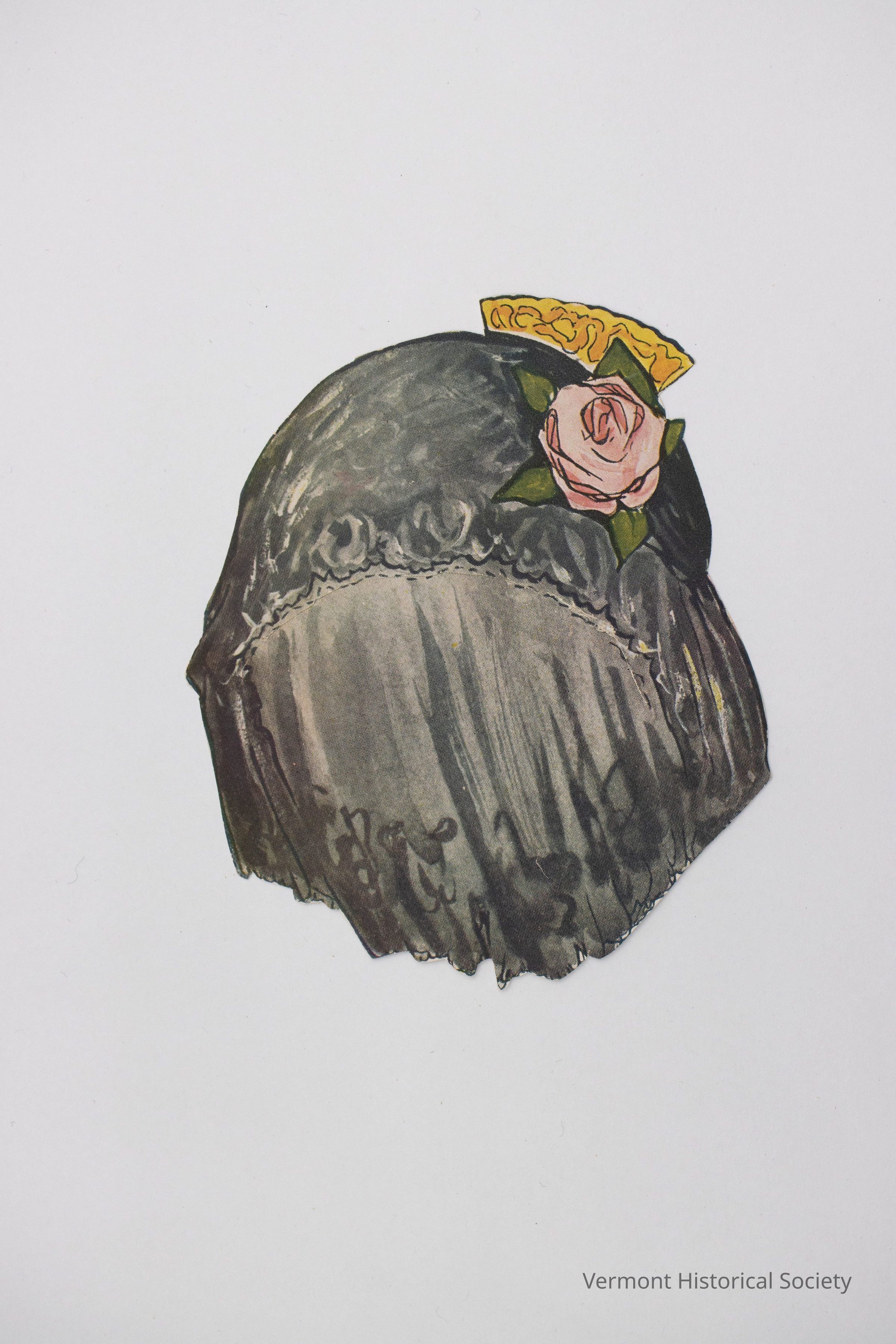 Printed paper veil for a paper doll. The black lace veil is decorated with a pink rose and gold comb. The back shows a portion of a sales catalog page.Context
