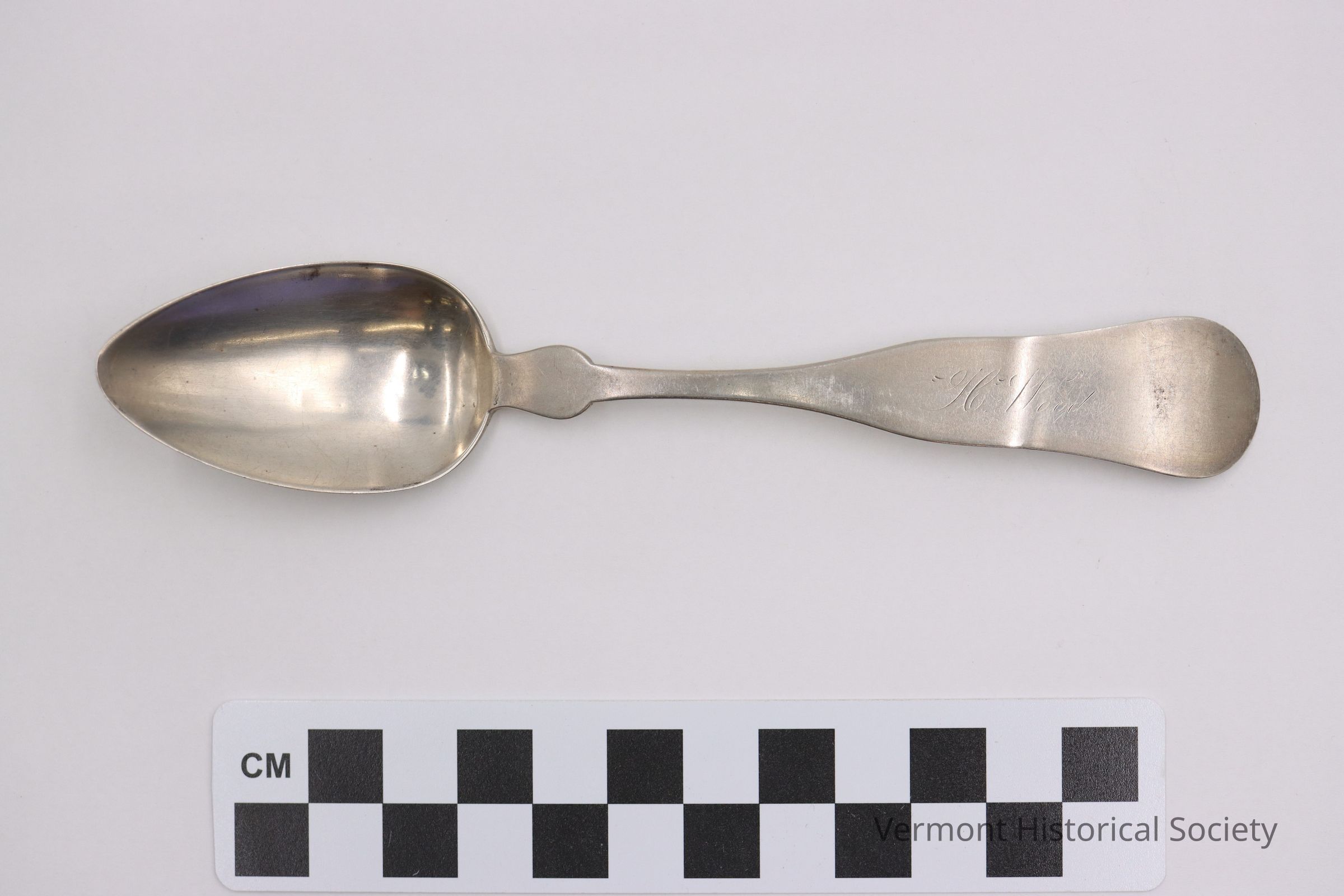Silver teaspoon with round shoulder and downturned fiddle handle. The handle is engraved with the name, "H. Wood." The back of the handle is marked, "CLARK & BROS."