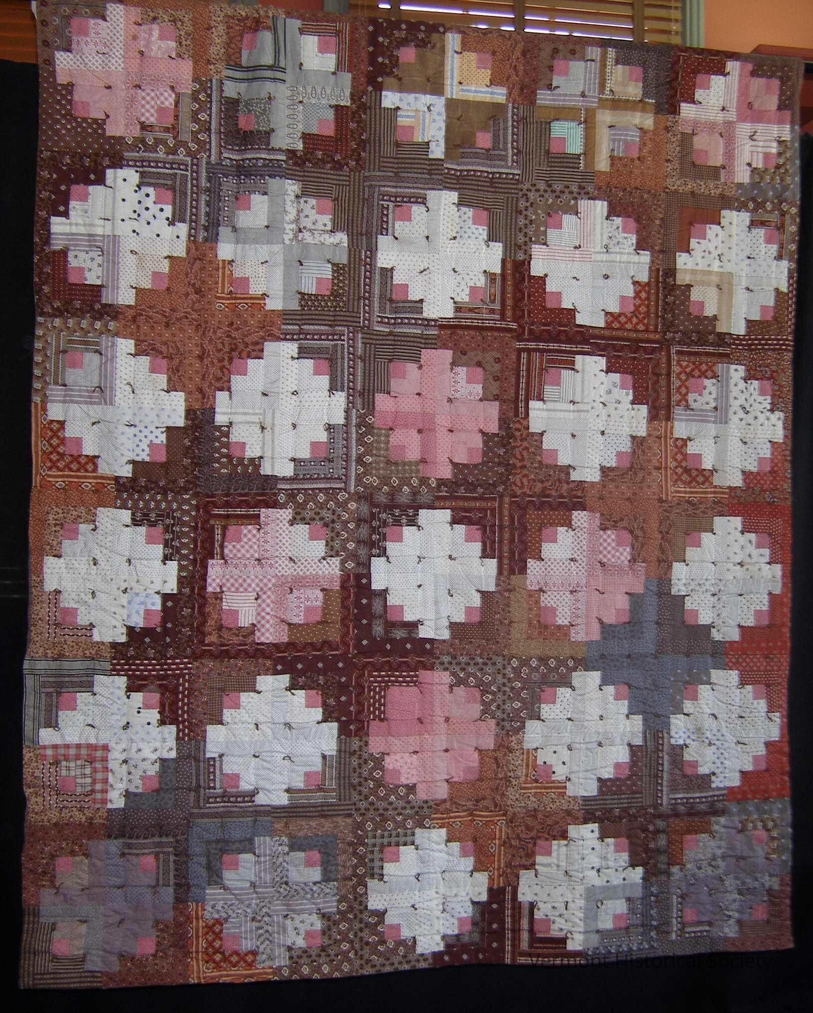 Pieced quilt in the Sunshine and Shadows variation of the Log Cabin pattern. The design is formed from thirty blocks. Each block contains four Log Cabin style blocks pieced around pink centers. The strips forming the pattern are primarily arranged with the light-colored pieces at the center and the dark-colored pieces at the corners. The placement pattern does not hold true at the top and bottom edges of the quilt. The quilt is backed with a pink-and-yellow plaid cotton and is tied rather than stitched.