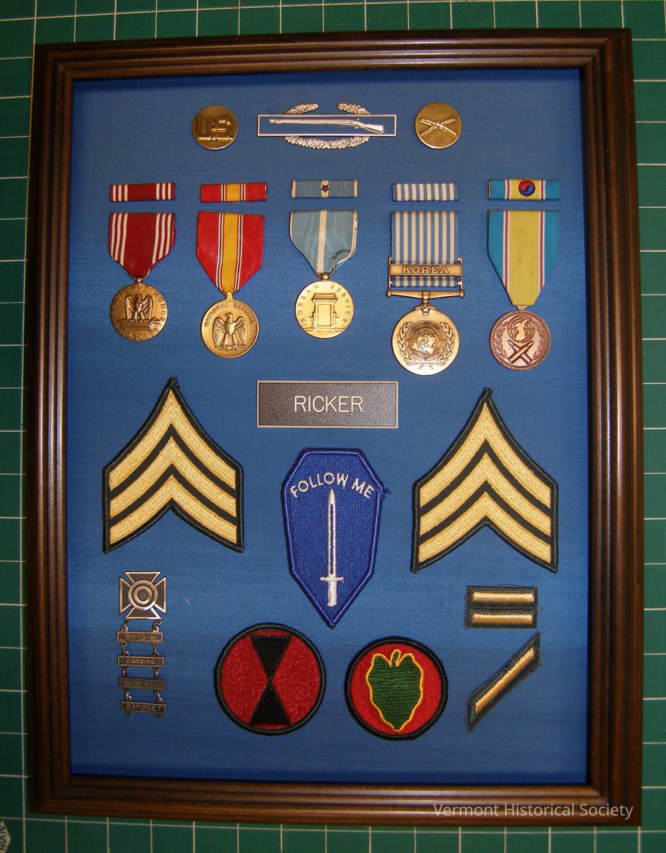 Shadow box display of medals. There are 22 objects displayed, including medals, ribbons, and insignia patches. They are: a U.S. collar insignia, an expert combat infantry badge, an infantry collar insignia, a good conduct medal and bar, and National Defense Service Medal and bar, a Korean Service medal and bar, a UN Korean War medal and bar, a Republic of Korea service metal and bar, a name badge with the name "RICKER", two chevron patches denoting the rank of sergeant, a patch with a sword and the words "FOLLOW ME", a sharpshooter medal with four qualified weapons, a red patch with black hourglass (7th Infantry division, Light), a red patch with a green leaf (24th Infantry division), and service bars.Context
