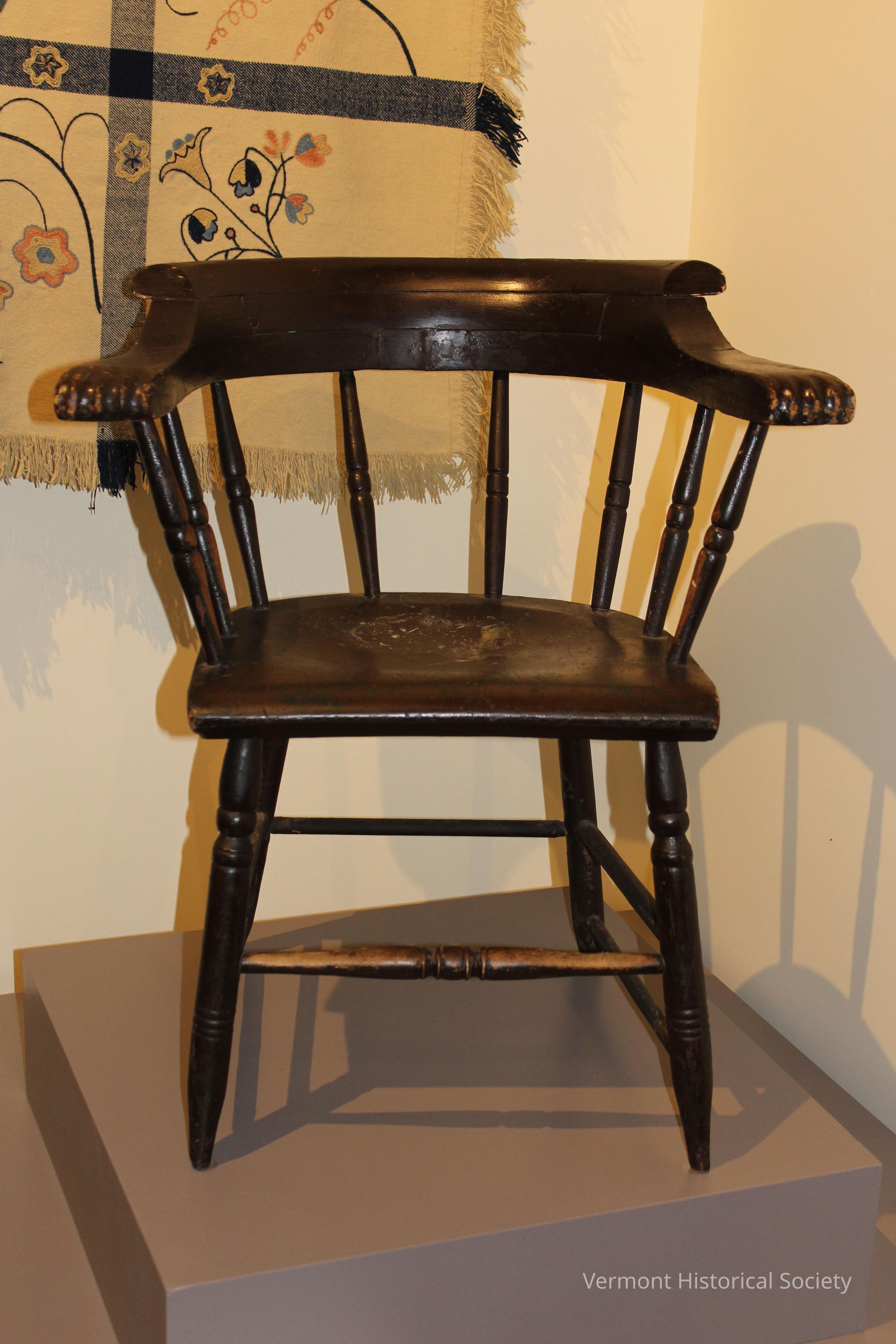 Knuckle arm Windsor chair with a plank seat, which has reportedly been used at the first Firehouse in Montpelier. It features a heavy construction and is not refined, with a dark stain. The back of the chair has two indentations, suggesting that something has previously been attached to it. Additionally, an impressed stamp reading "N. Goodale" can be found on the bottom of the chair, potentially indicating the name of its maker.Context