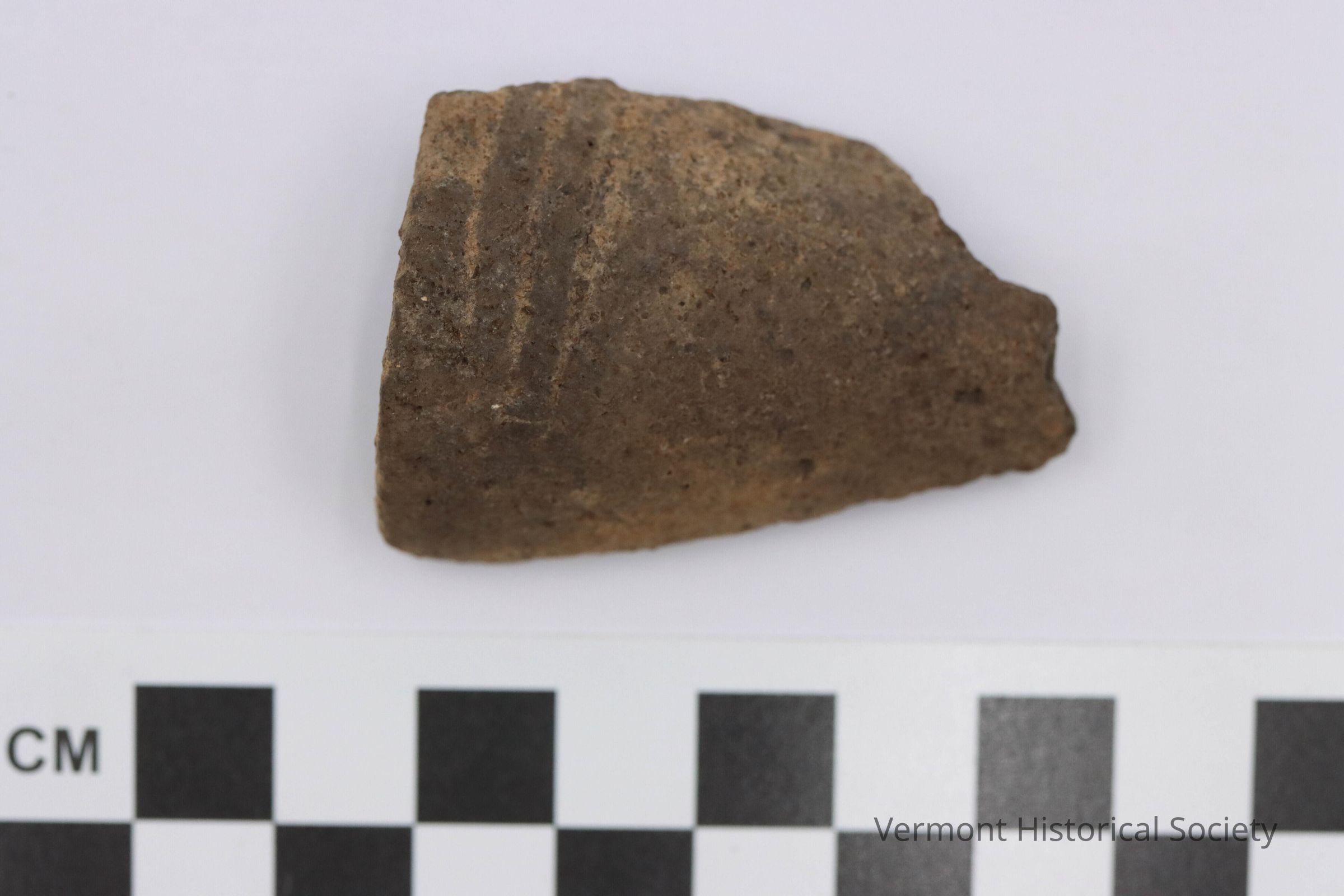 Fragment of a pipe bowl. It is decorated with three incised lines below a flat lip.