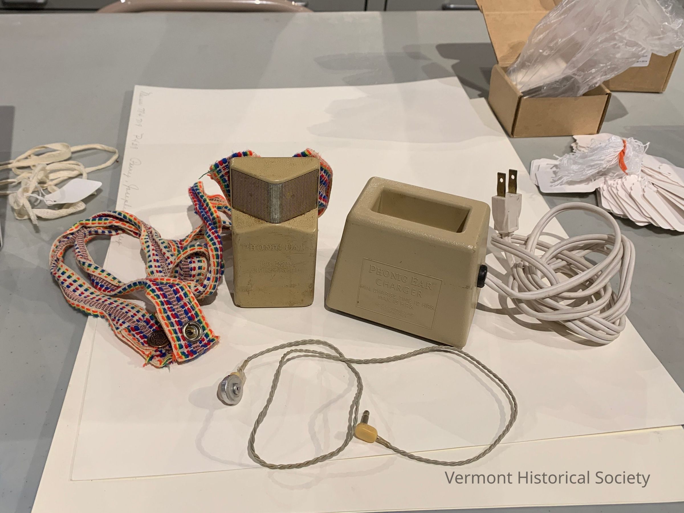 Rectangular, beige hearing aid device with plastic exterior (a) with "PHONIC EAR" label on front and (c)rainbow patterning fabric ribbon straps with copper eagle crest snaps. It is standing within a slanted rectangular stand (b) also in a muted beige plastic with the inscription in the front inside a square, "PHONIC EAR CHARGER MIN CHARGE TIME 12 HRS MAX. 18 HRS HC ELECTRONICS INC TIBURON CALIF." It is standing on four grey feet and includes an attached thick white double stranded charging chord with a white wall plug. Also includes the earpiece (d) with a double stranded chord, a single prong plug, and a light pink disc for the ear insert.Context