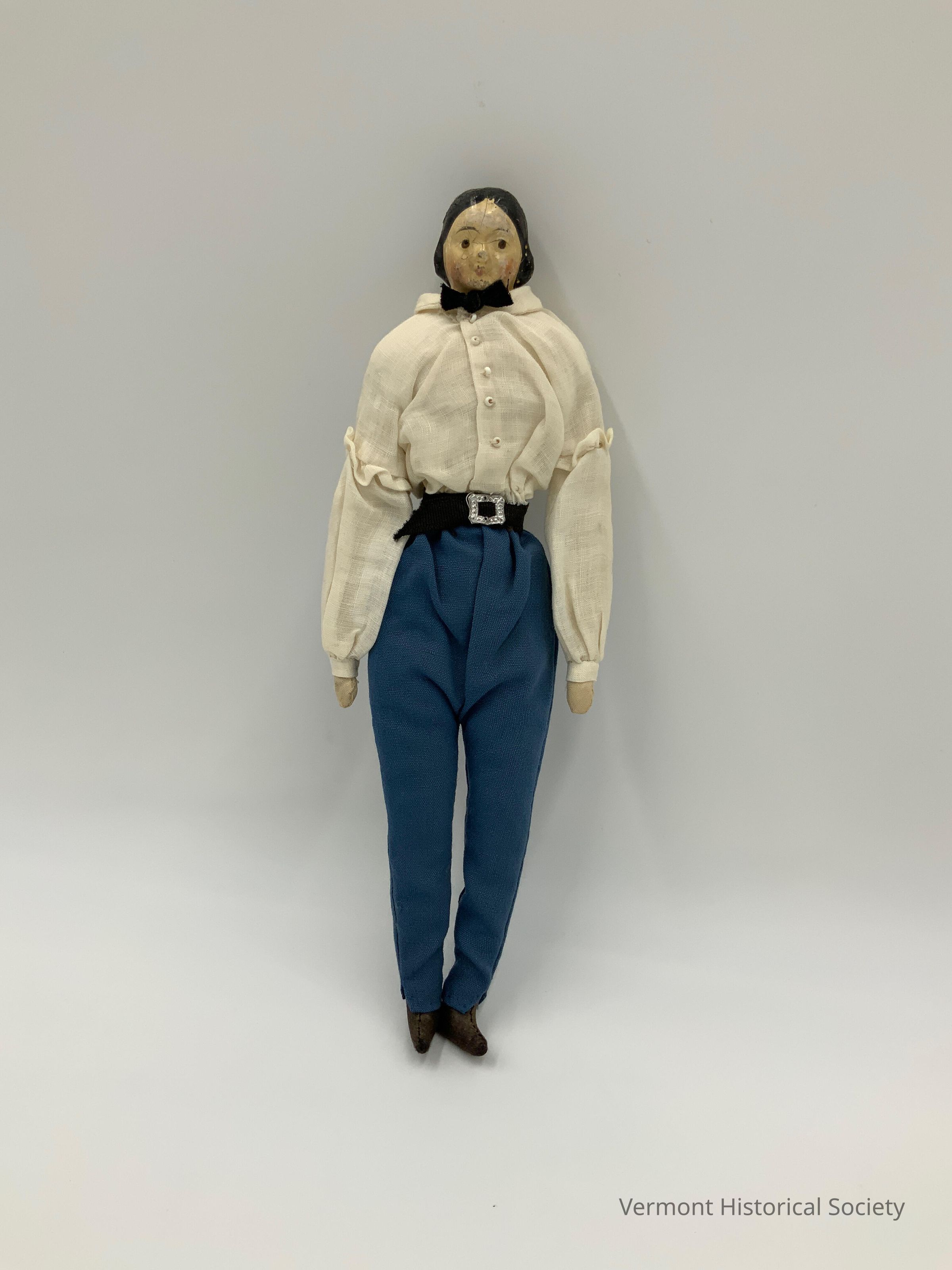 Doll with a soft body and wood bust. The bust is plastered and painted with cream-colored skin, black hair, and facial features. The hair is molded into a short bob. The doll is wearing a white shirt, blue trousers, black belt, black shoes, and black bow tie. The shirt has ruffles at the dropped shoulder seams and seed bead "buttons" down the center front. There is a black bowtie at the center of a dropped collar. The belt is cinched very tightly and has a rectangular silver buckle. The trousers are blue and pleated into the waist.Acquisition