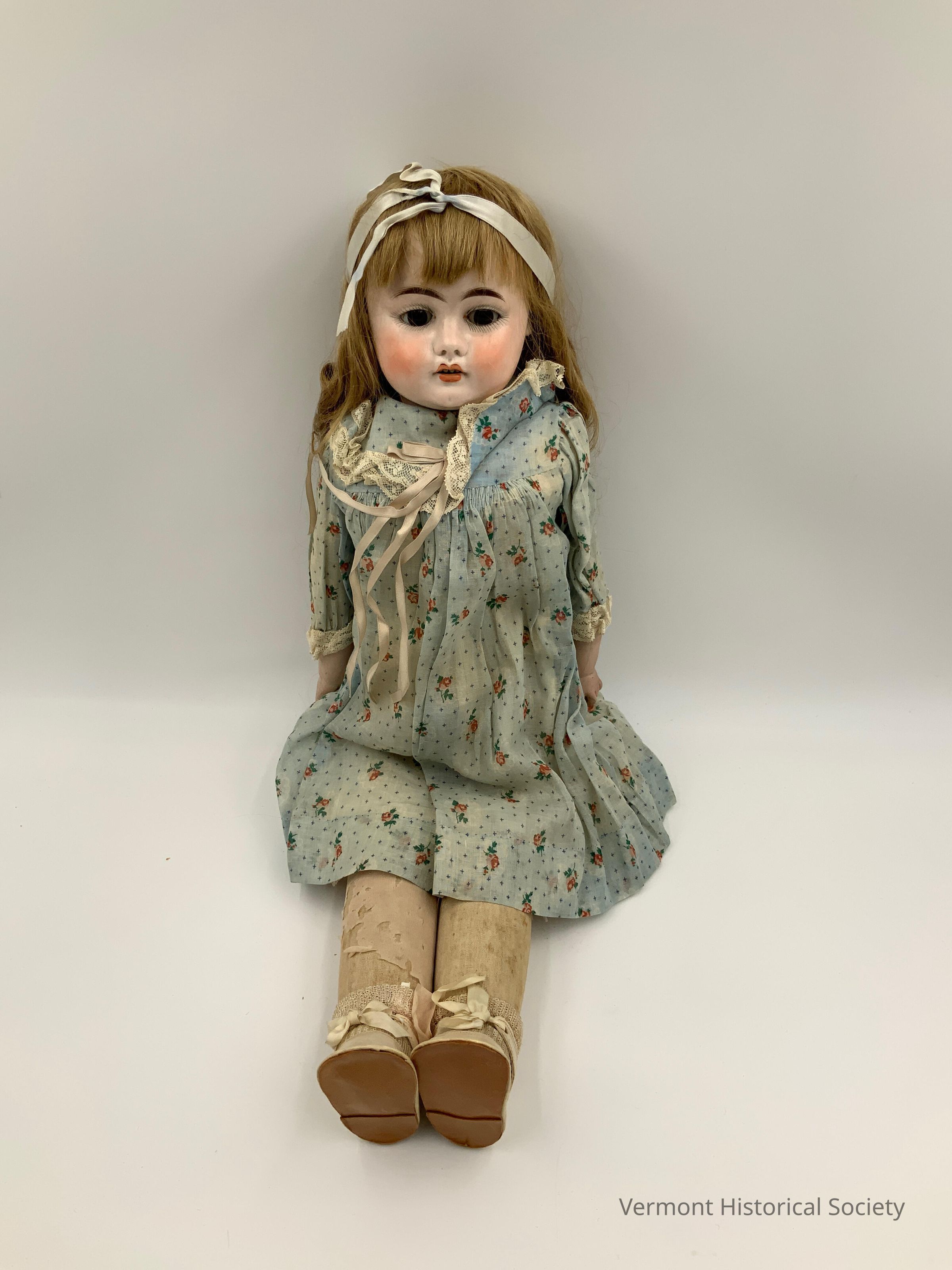 Soft-bodied doll with porcelain head and hands. The doll has inset glass eyes (brown), and painted on facial features, including large eyelashes, eyebrows, and an open mouth showing rounded teeth. The doll has light brown hair, said to be the hair of Sarah Lawrence. The doll is wearing a dress made of blue cotton sprigged with pink flowers and blue + symbols. The legs are covered in light pink silk (in tatters), and the feet have white knitted socks with white leather Mary Jane shoes. There is a white satin ribbon tied around the doll's head.Context
