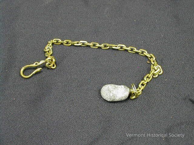 Gold-toned metal watch chain with an unformed piece of lead at one end, and a hook at the other end. The hook is molded into the shape of a snake head.