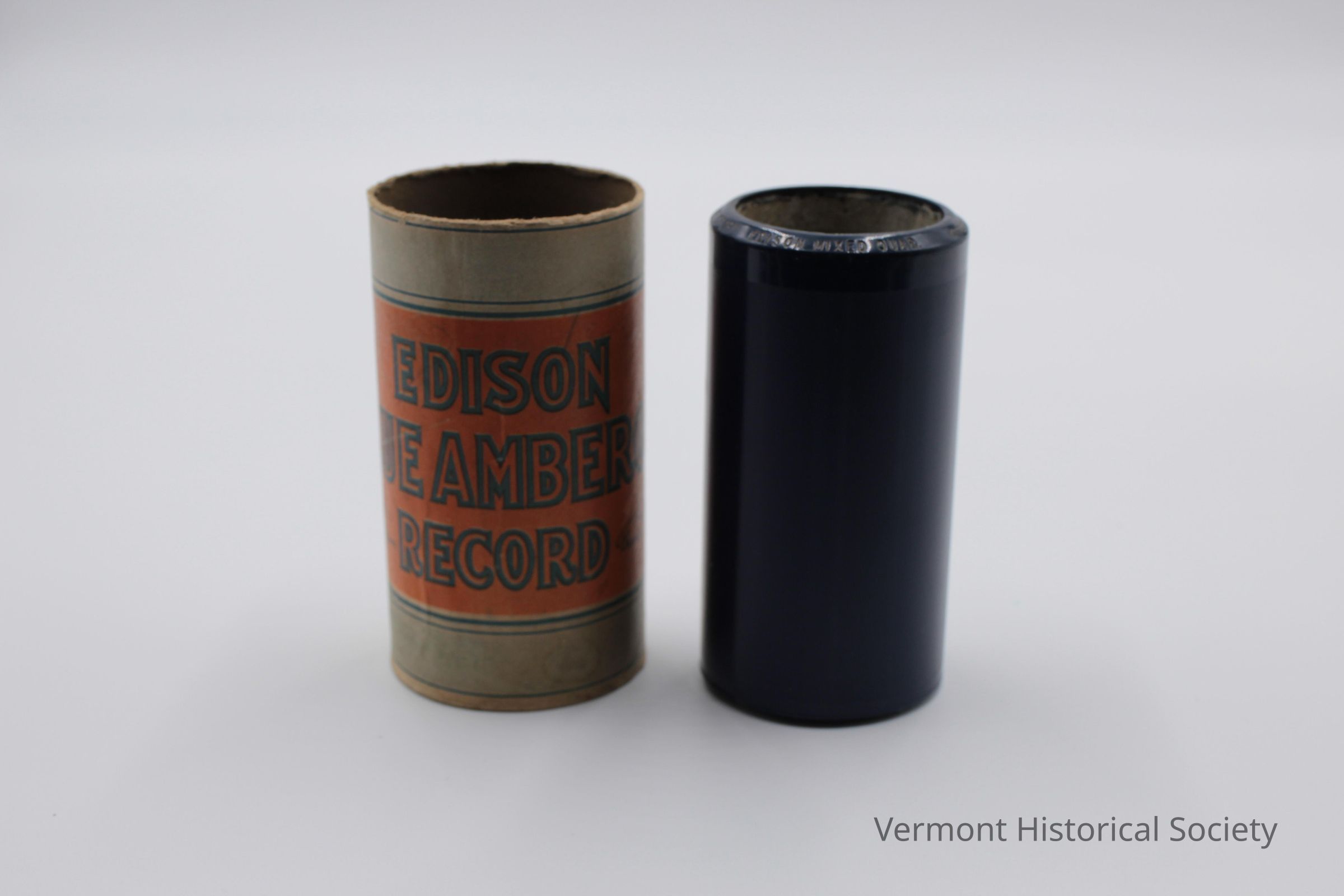 The cylinder is accompanied by a cardboard case. The case is labeled on one side with the words, "EDISON BLUE AMBEROL RECORD", in blue on an orange ground. The other side is printed with a photographic portrait of Thomas Edison above the patent and trademark information and the price (60 cents).Use
