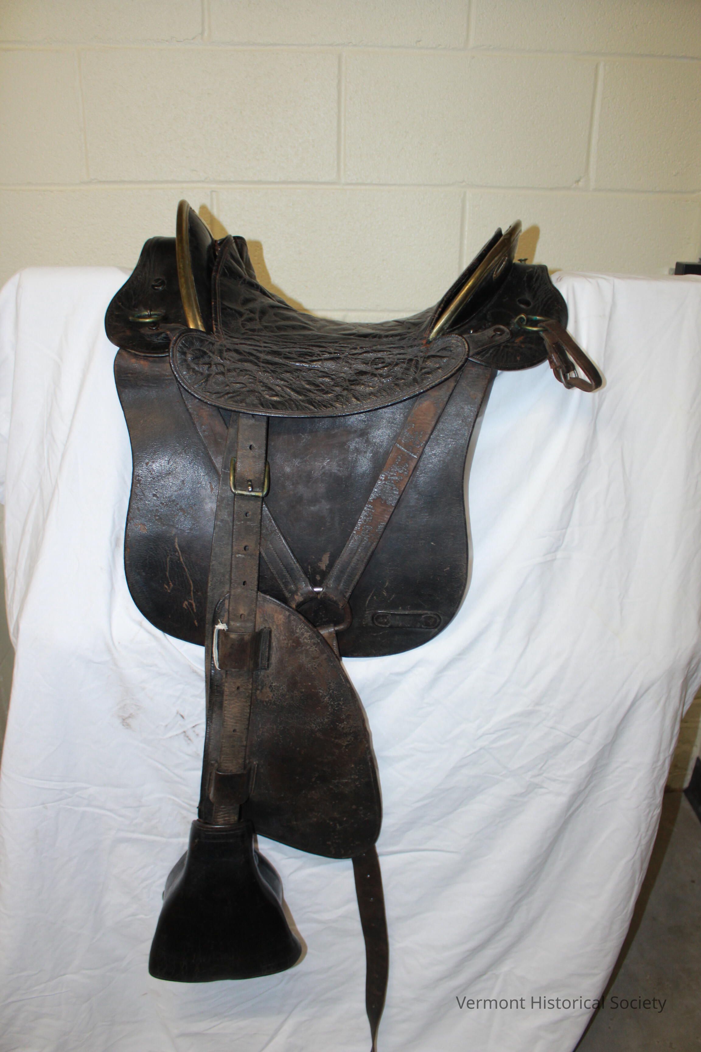 Civil War era McLellan saddle. The interior wood tree is covered by rawhide leather. The top of the is tree covered in black leather, and the pommel and cantle are edged in brass. The skirts are black leather, attached to saddle with brass screws. There are three brass-edged slots in the cantle; the pommel has one slot, surrounded by shield-shaped brass (with no inscription). A quilted seat cover affixes over the top via slots and rivets; the seat cover is black leather on top, with rough twill woven fabric on back. There are multiple rings front and back to attach gear. Leather girth buckles to right side of saddle, with cinch strap sewn to D-ring on saddle at left side, that goes through d-ring on girth and then buckles to secure. Stirrups are constructed of wood and covered with black leather. The stirrups each have a leather hood attached with leather covered brass rivets. Leg guards are of thick leather, with leather loops that stirrup leathers slide through.Context