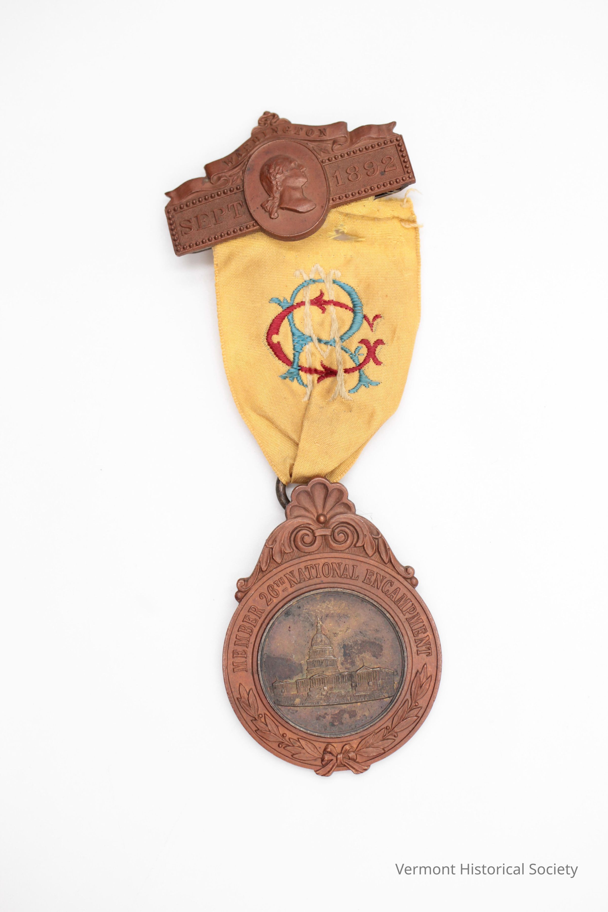 Membership ribbon consisting of a rectangular bar, a yellow ribbon, and a round medallion. The bronze bar has decorative scrollwork, a bust of George Washington, and the inscription, "SLPT 1892". There is a hinged pin on the reverse. A yellow grosgrain ribbon is looped and stitched onto a wire on the back. The ribbon is embroidered with the monogram, GAR, in red, white, and blue. From an eye hook looped through the bottom of a ribbon hangs a round bronze-framed medallion with an image of the United States capitol building. The inscription, "MEMBER 26TH NATIONAL ENCAMPMENT" rings the edge. The back of the medallion shows and army marching through a city with the inscription, "PRESENTED BY THE CITIZENS OF WASHINGTON, D.C."Context