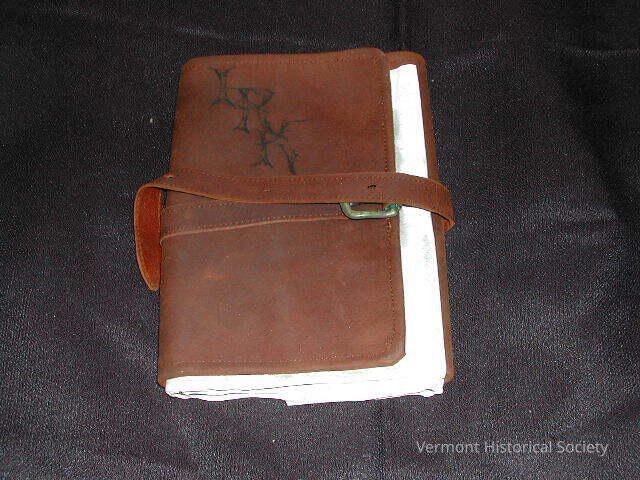 Brown leather wallet roll. It unfolds into a long rectangle with several interior pockets. It is held closed with a long leather strap that secures into a metal buckle. The initials "IRK" are inked onto the front. It is lined with white satin.