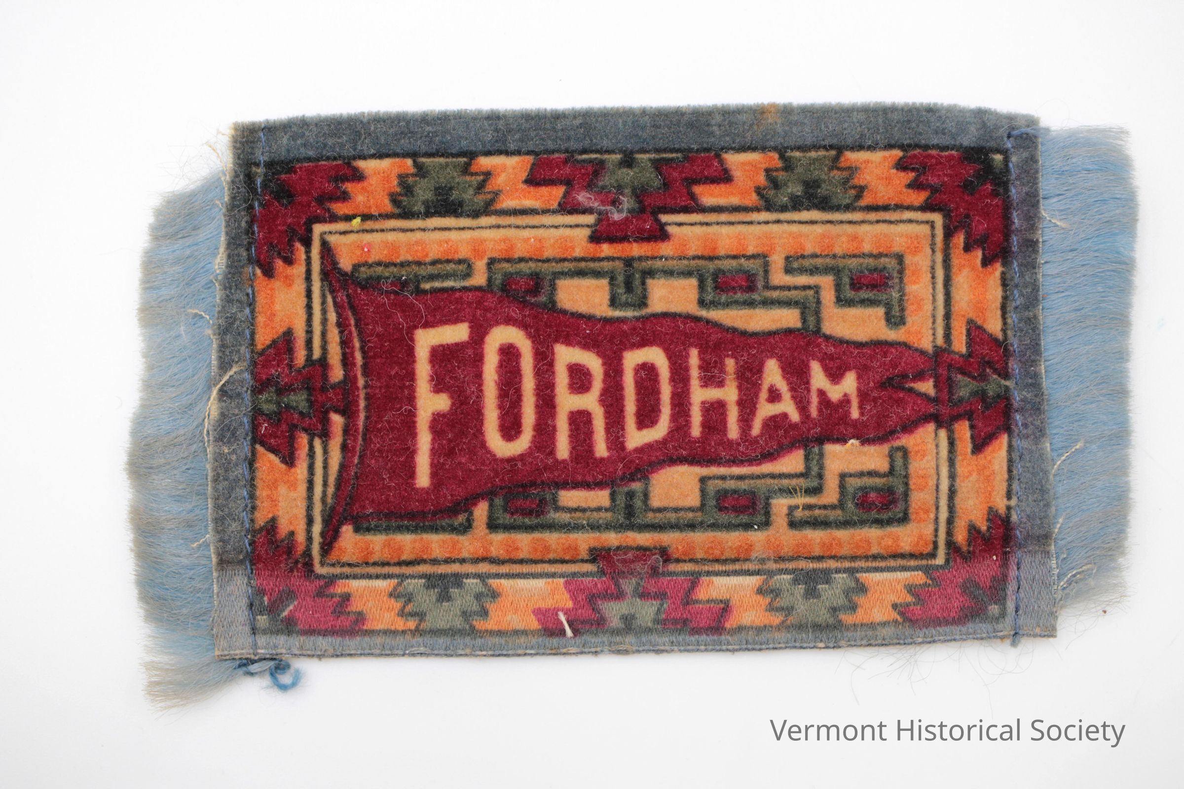 Miniature rug sized for a dollhouse. The rug is printed with a southwestern design beneath a burgundy pennant that reads, "FORDHAM". There is blue fringe stitched to each short edge of the rug.Context