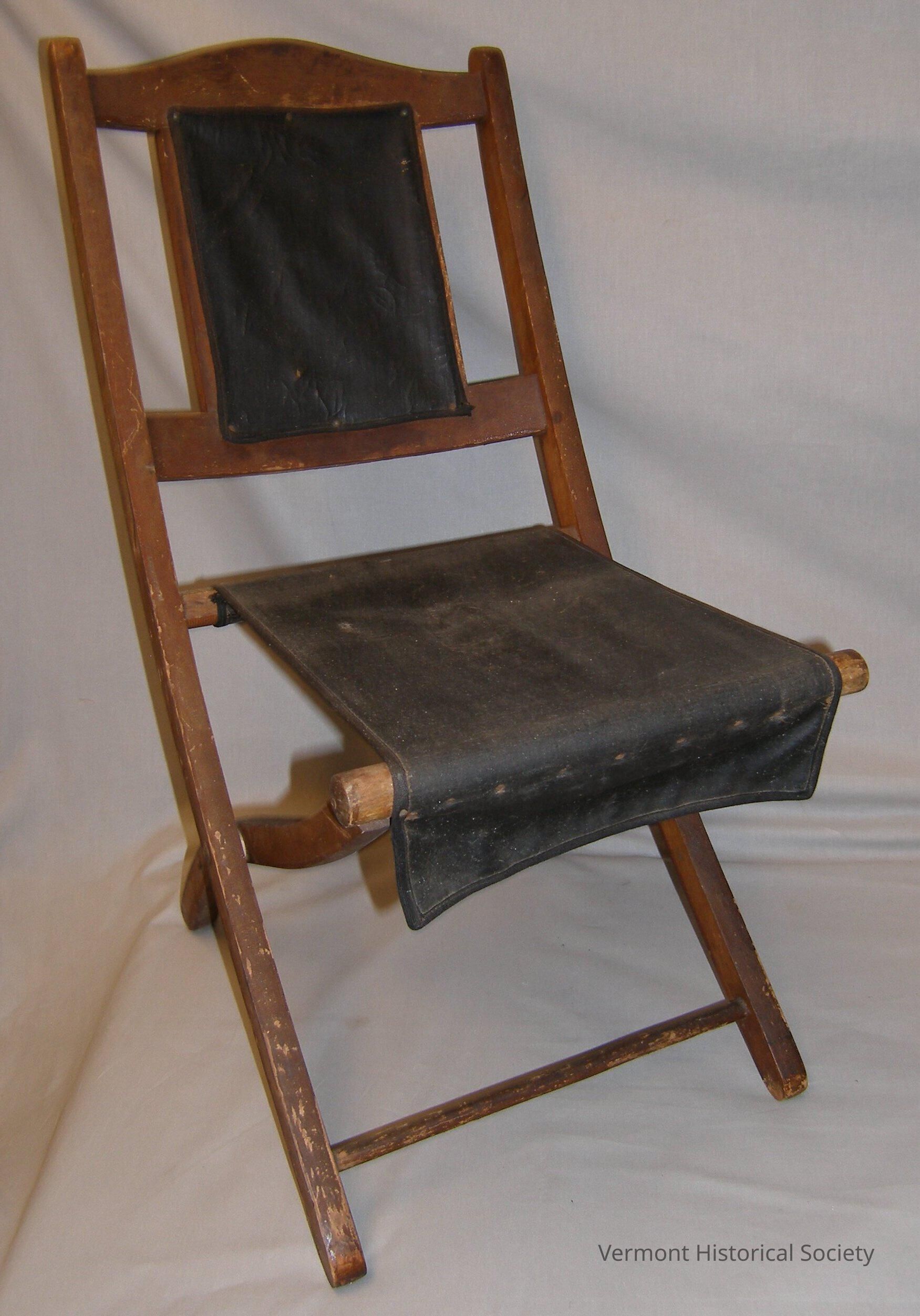 This folding chair has a wooden frame. The seat of the chair is made by tacking black oilcloth fabric, which has been tarred, to the front and back of the chair. This creates a sling seat, with an additional smaller piece of the same fabric tacked onto the center of the backrest. The lower back rail of the chair has the words "Barry & Badger" stenciled in black on it.