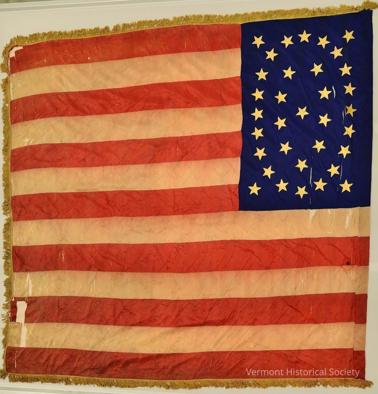 5th Vermont Infantry Regiment national flag. Flag attached to staff by a sleeve. Canton has rectangular shape. 34 gold painted stars are arranged in a double ellipse. Flag has knotted fringe. Flag is plain weave, with warped face.