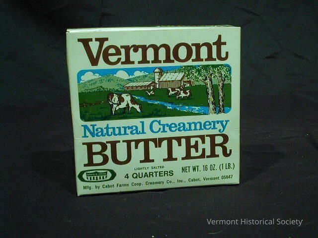 One piece, collapsible box. Printed on top: "Vermont / Natural Creamery / BUTTER / LIGHTLY SALTED / 4 QUARTERS / NET WT. 16 OZ. (l LB.) / State's Pride / Mfg. by Cabot Farms Coop. Creamery Co., Inc., Cabot, Vermont 05647" Originally used in exhibition "200 Years of Making a Living in Vermont".Acquisition