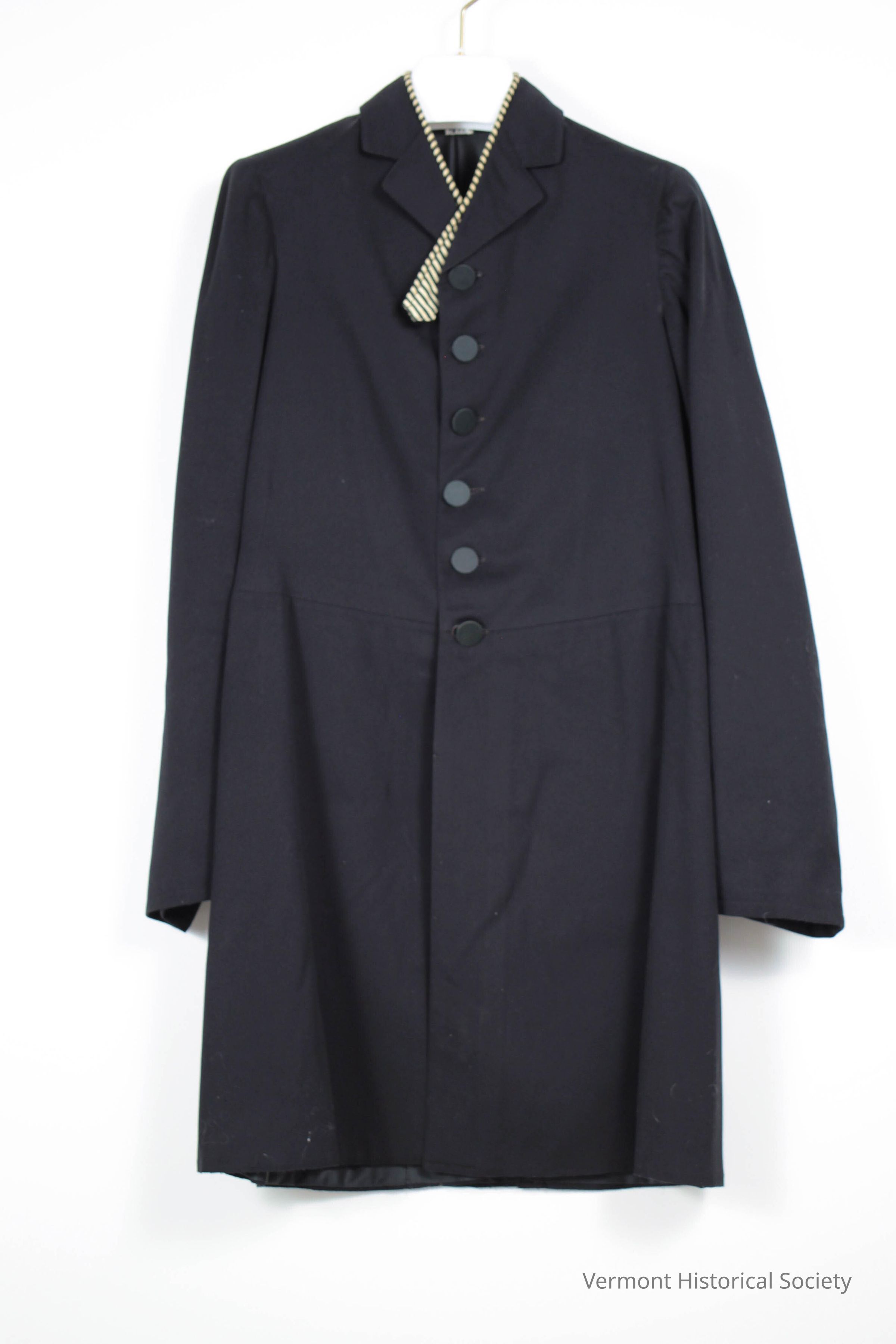 Black wool coat. The coat is secures down the center front with a single row of 6 black buttons. There is a seam around the waistline, accented with self piping. Two pockets are inset beneath the waistline. The coat has a pointed falling collar and is faced with black-and-white striped silk that shows above the collar like piping when worn. The hemline reaches to the wearer's knees.