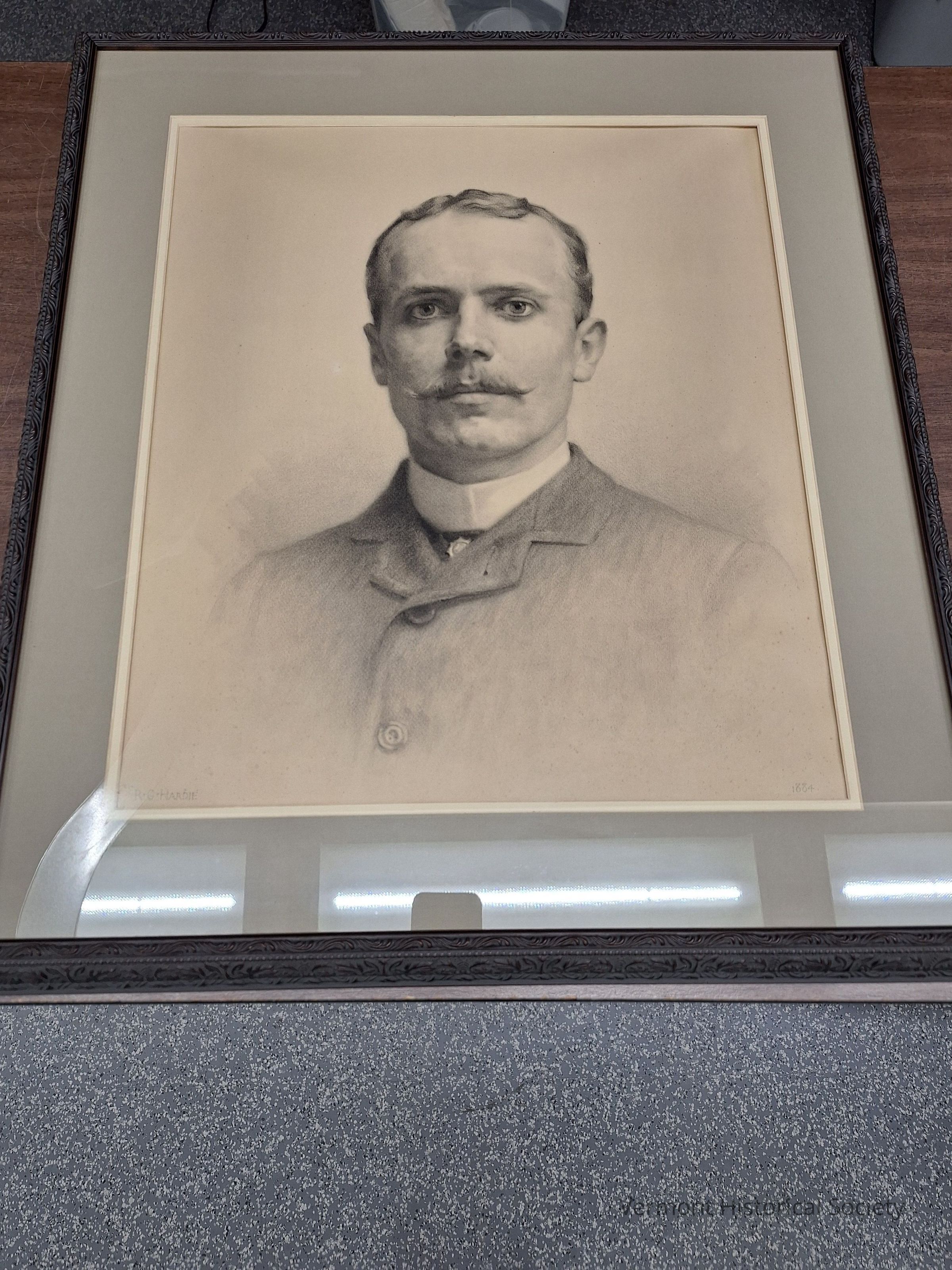 Pencil on paper portrait of William Brooks Cabot by Robert Gordon Hardie. The drawing shows Cabot gazing straight out at the viewer wearing a high starched collar and dark suit jacket buttoned nearly to the chin. The drawing is signed, "R.G. HARDIE" in the lower left corner.