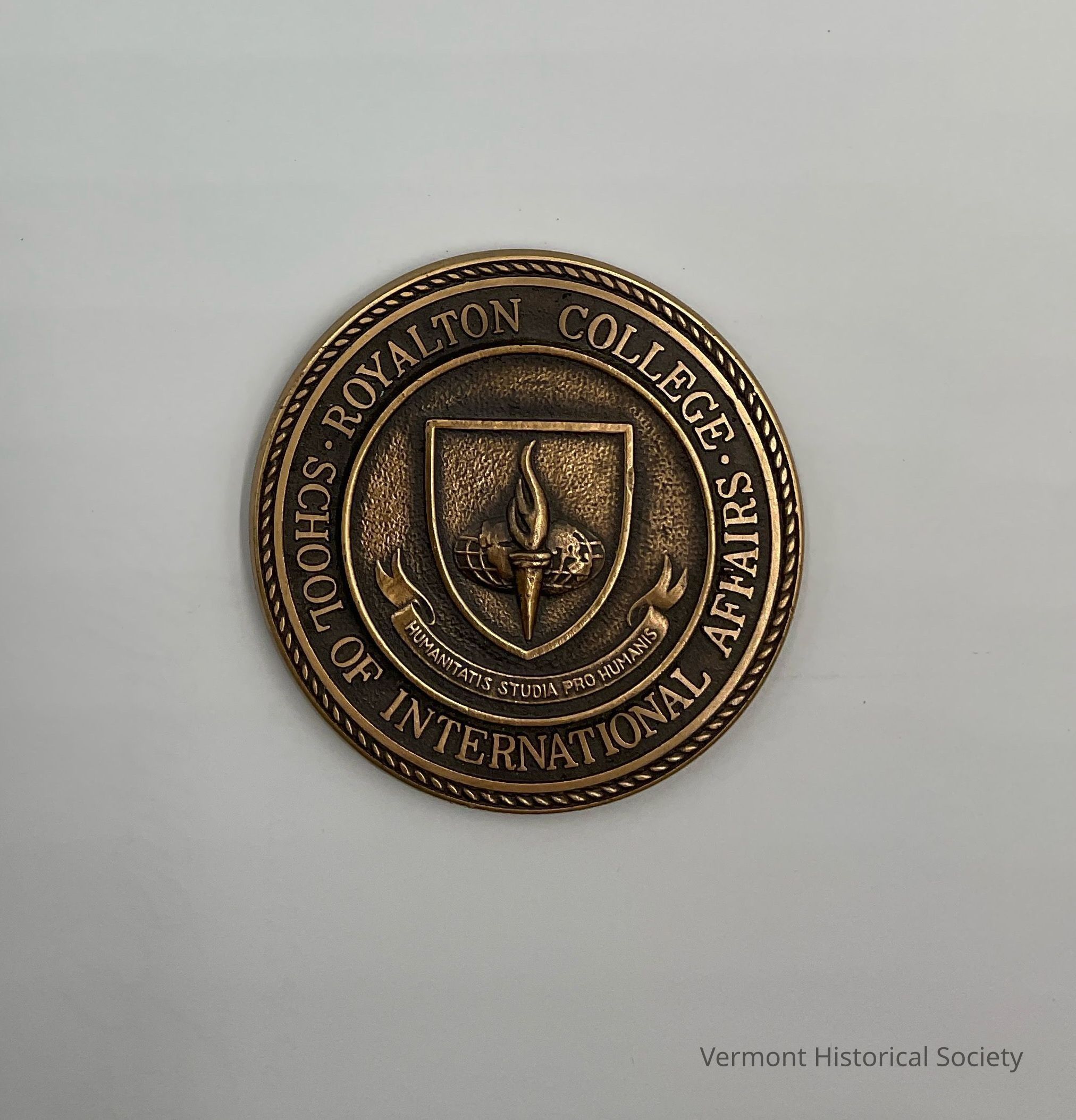 A 3-inch bronze-colored paperweight with the wording "Royalton College School of International Affairs" encircling a shield with a torch and a globe and the Latin phrase "Humanitatis Studia Pro Humanis" which means "Humanities for Humans." The other side has a cork-like layer.Context