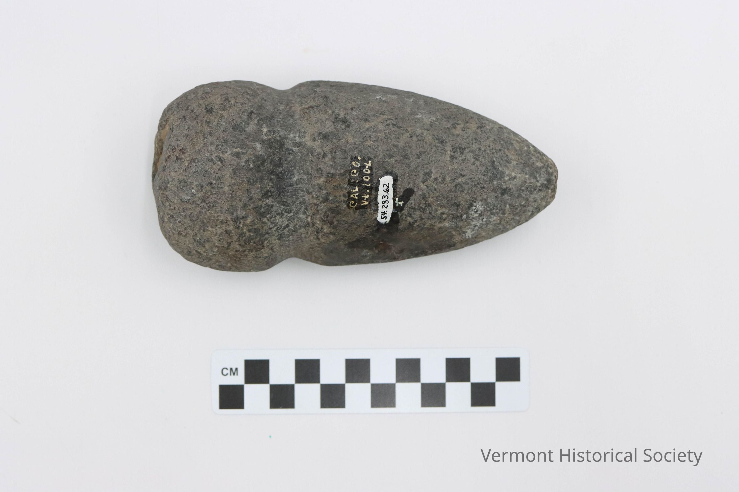Ground stone ax head. It is flat on one side and rouded on the other.Context