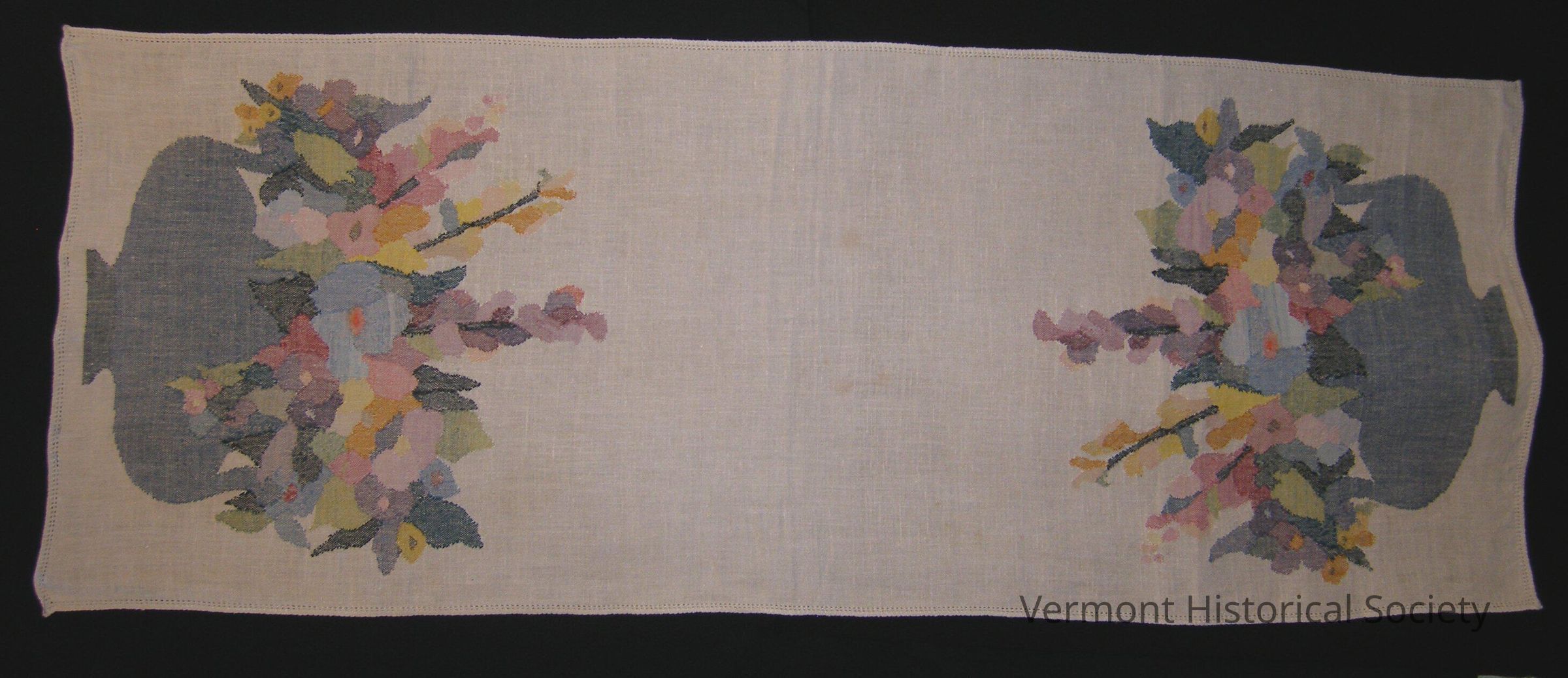 Handwoven tapestry-weave linen table runner with a pattern of a large blue vase filled with blue, pink, lavender and yellow flowers with green leaves and stems, at both ends of runner. Drawn-work border.