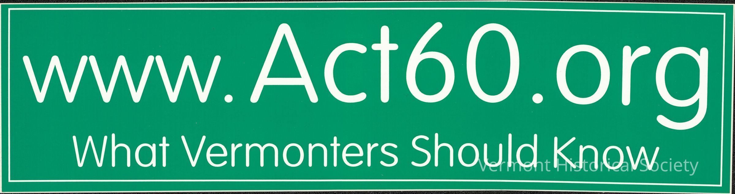 Bumper sticker with wording "www.Act60.org What Vermonters Should Know" in white text on green background