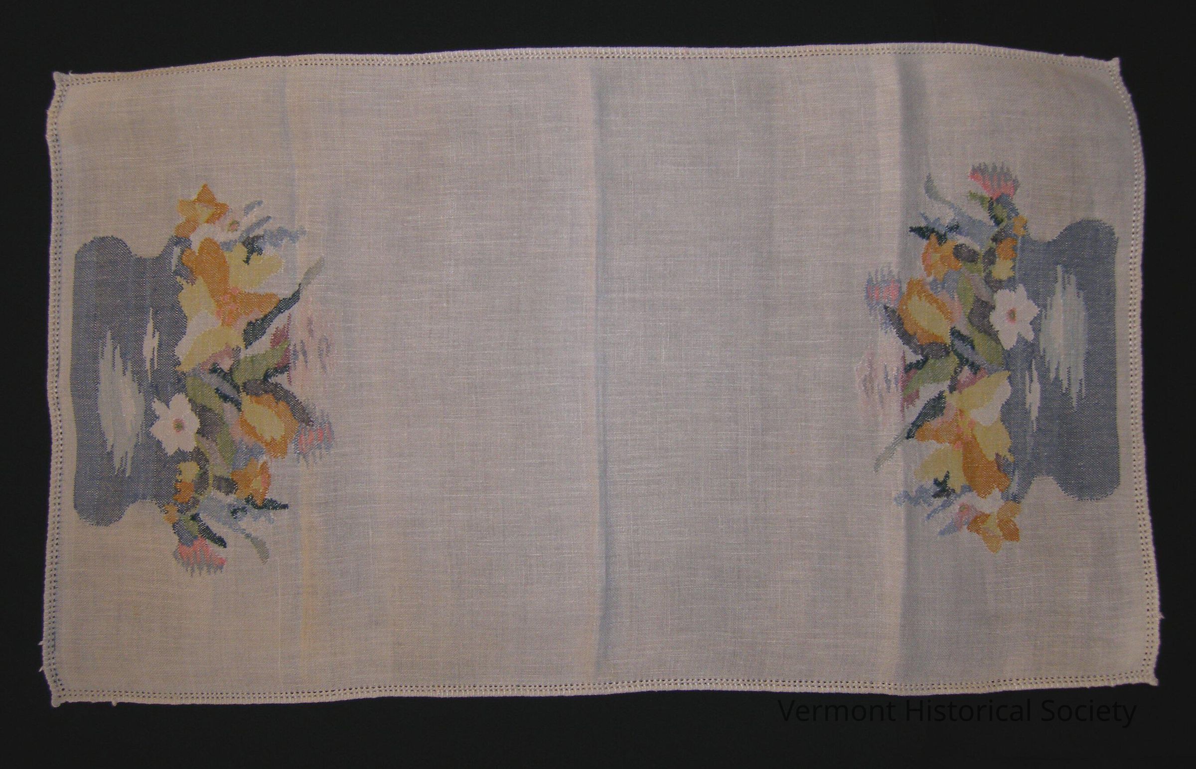 Handwoven tapestry-weave linen bureau scarf with design at each end of a blue and white vase with yellow, orange, blue and pink flowers with dark green leaves and a drawn-work border.