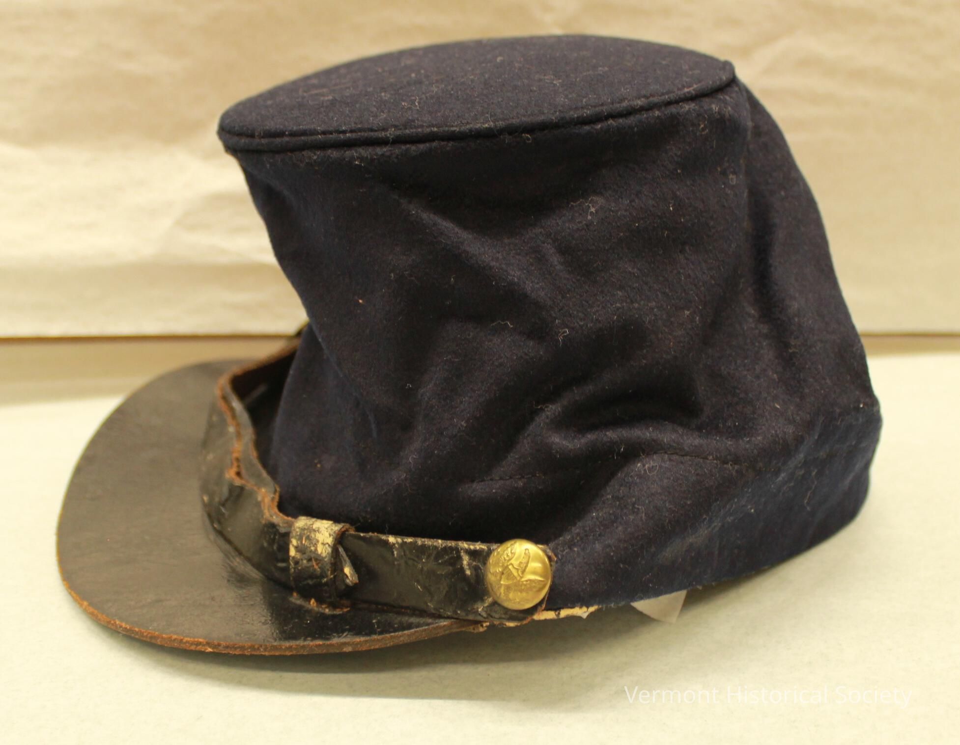 Tall, navy blue felted wool forage cape with shiny black leather brim. There is a black leather strap across the front where the brim attaches to the crown. The strap is secured by two brass buttons on either end, which are molded with a federal eagle. The cap is lined with glazed cotton and there is a leather band around the edge. A paper label in the center of the interior reads, "SIZE No. 3, U. S. Army. L J & I P".