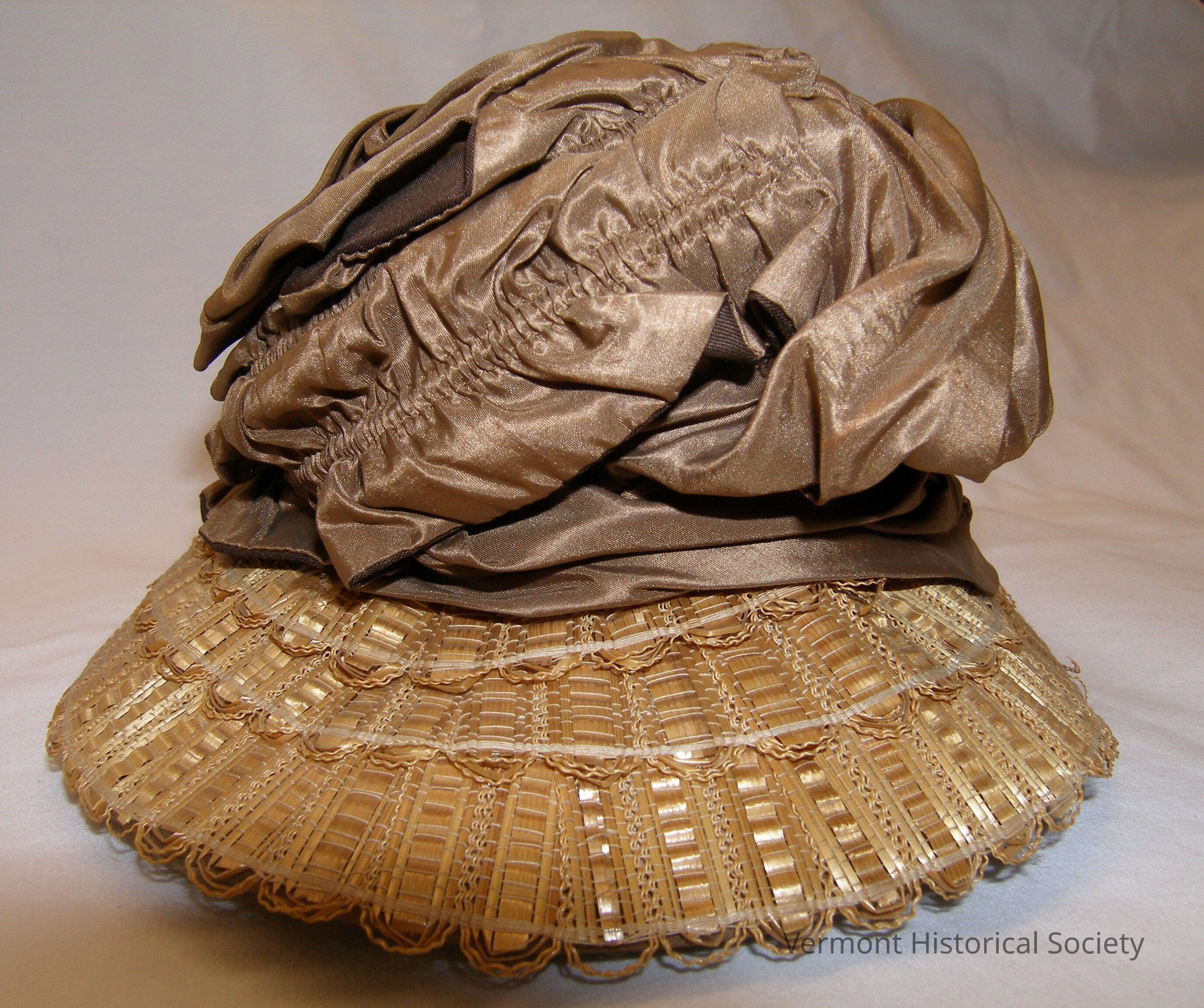 Bonnet or hat with decoratively-woven straw bring and brown silk covered crown. The straw portion is stitched from length of straw picot ribbon. The silk portion utilizes lengths of silk ruched over a cord the decoratively wrapped and tacked onto the crown base. The interior of the hat is lined with white netting.Context
