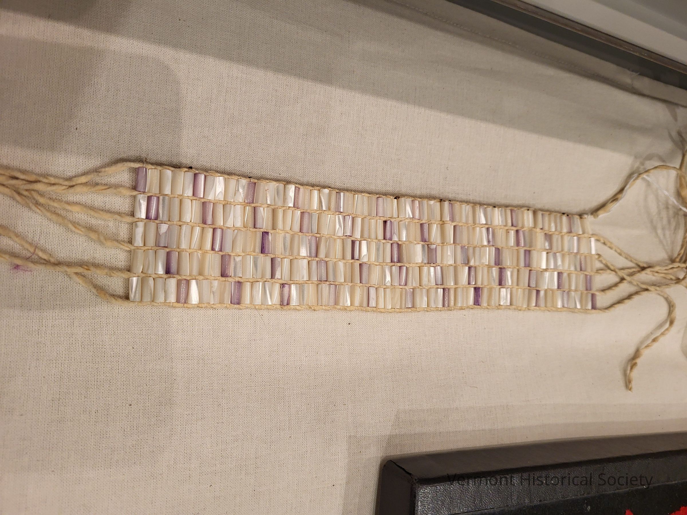 This is a wampum belt made in 1962 by Frederick Wiseman from the poorly dyed mother-of pearl wampum beads that were all that could be purchased at the time. He believes that he purchased the leather and shell beads from Grey Owl Indian Crafts Company. This was his first attempt at loom-beaded Native craft, the first of maybe 30 made since then.
